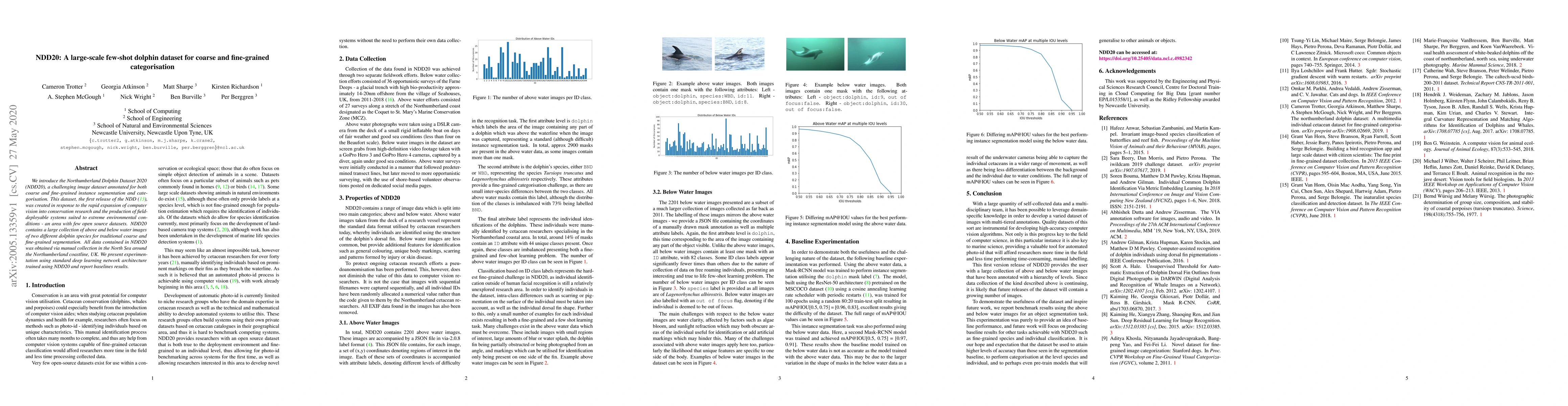 We introduce the Northumberland Dolphin Dataset 2020 (NDD20), a challenging image dataset annotated for both coarse and fine-grained instance segmentation and categorisation. This dataset, the first release of the NDD, was created in response to the rapid expansion of computer vision into conservation research and the production of field-deployable systems suited to extreme environmental conditions -- an area with few open source datasets. NDD20 contains a large collection of above and below water images of two different dolphin species for traditional coarse and fine-grained segmentation. All data contained in NDD20 was obtained via manual collection in the North Sea around the Northumberland coastline, UK. We present experimentation using standard deep learning network architecture trained using NDD20 and report baselines results.