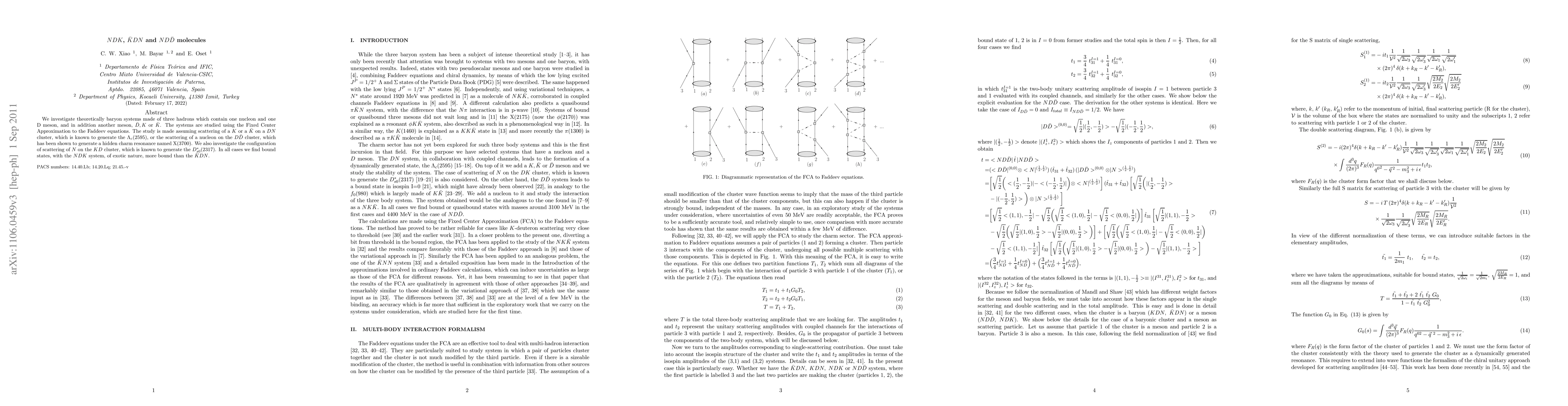 We investigate theoretically baryon systems made of three hadrons which contain one nucleon and one D meson, and in addition another meson, $\bar{D}, K$ or $\bar{K}$. The systems are studied using the Fixed Center Approximation to the Faddeev equations. The study is made assuming scattering of a $K$ or a $\bar{K}$ on a $DN$ cluster, which is known to generate the $\Lambda_c(2595)$, or the scattering of a nucleon on the $D\bar{D}$ cluster, which has been shown to generate a hidden charm resonance named X(3700). We also investigate the configuration of scattering of $N$ on the $KD$ cluster, which is known to generate the $D_{s0}^*(2317)$. In all cases we find bound states, with the $NDK$ system, of exotic nature, more bound than the $\bar{K} DN$.