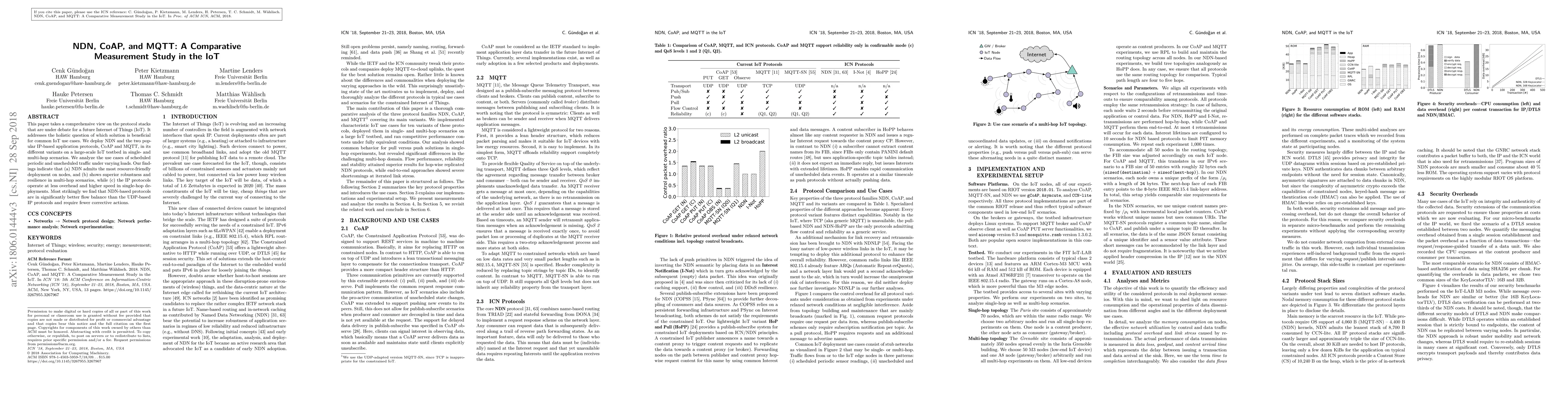 This study compares NDN, CoAP, and MQTT in IoT scenarios, finding that NDN is more resource-efficient and resilient in multi-hop networks, while CoAP and MQTT perform better in single-hop deployments with lower overhead and higher speed.