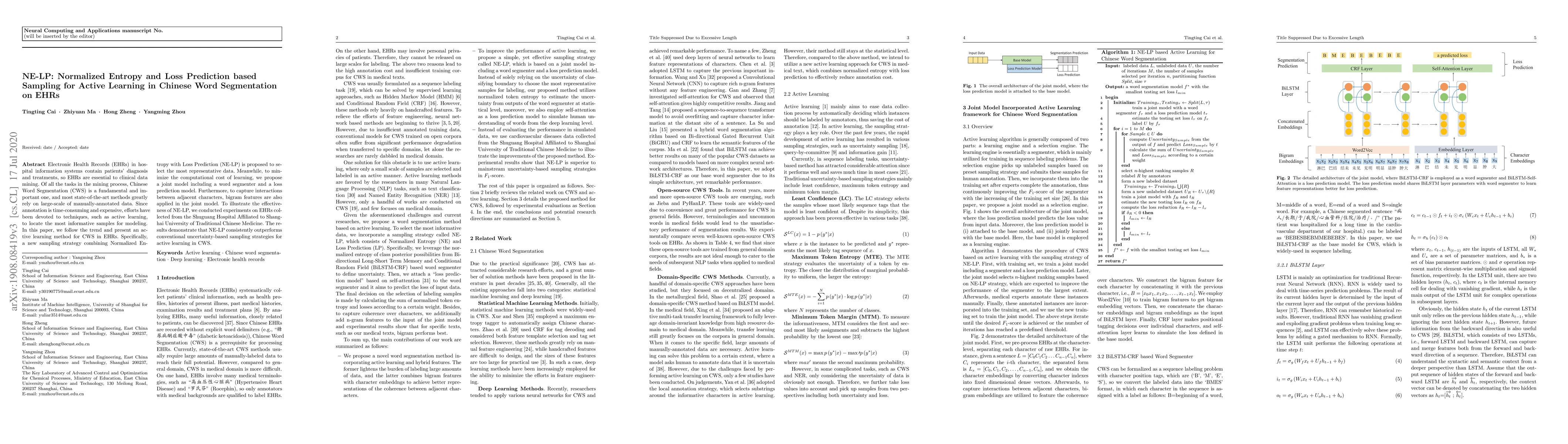 This paper proposes an active learning method for Chinese Word Segmentation (CWS) in Electronic Health Records (EHRs) using a new sampling strategy called Normalized Entropy and Loss Prediction (NE-LP). The method aims to select the most informative samples to minimize the need for costly manual annotations, employing a joint model with bigram features for improved performance. Experimental results show NE-LP outperforms traditional uncertainty-based methods.