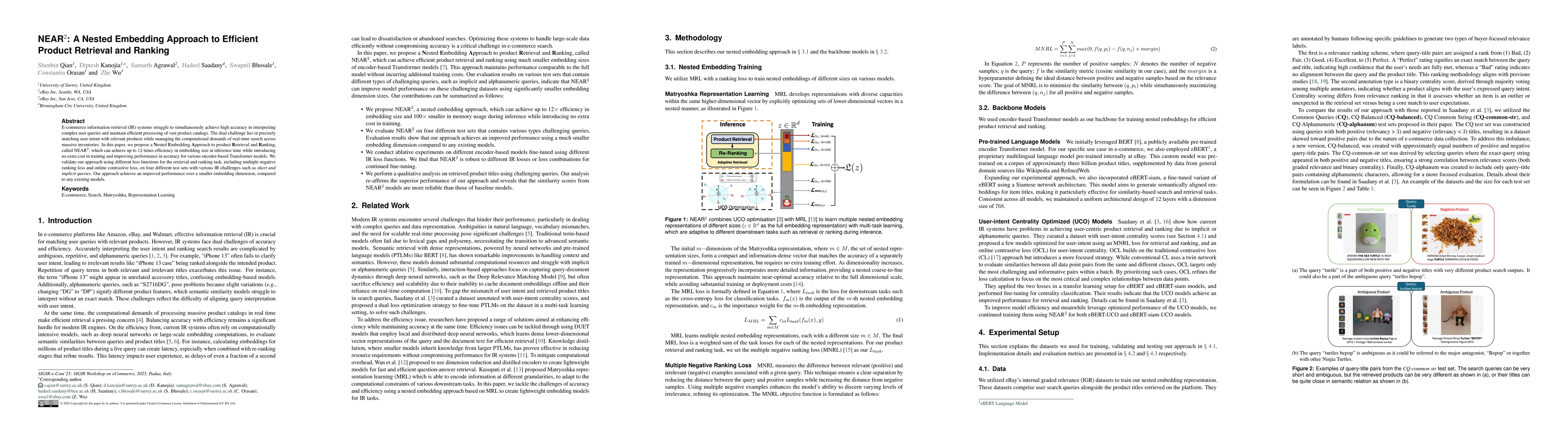 E-commerce information retrieval (IR) systems struggle to simultaneously achieve high accuracy in interpreting complex user queries and maintain efficient processing of vast product catalogs. The dual challenge lies in precisely matching user intent with relevant products while managing the computational demands of real-time search across massive inventories. In this paper, we propose a Nested Embedding Approach to product Retrieval and Ranking, called NEAR$^2$, which can achieve up to $12$ times efficiency in embedding size at inference time while introducing no extra cost in training and improving performance in accuracy for various encoder-based Transformer models. We validate our approach using different loss functions for the retrieval and ranking task, including multiple negative ranking loss and online contrastive loss, on four different test sets with various IR challenges such as short and implicit queries. Our approach achieves an improved performance over a smaller embedding dimension, compared to any existing models.