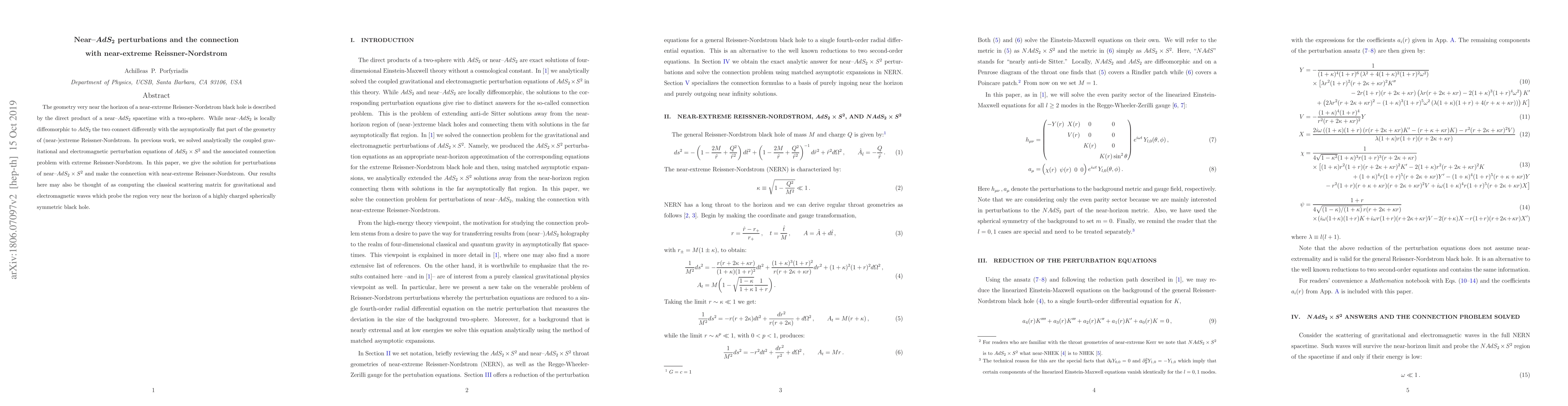 This paper investigates the geometry near the horizon of a near-extreme Reissner-Nordstrom black hole, showing that it is described by a near-$AdS_2$ spacetime product with a two-sphere. The study provides an analytical solution for perturbations in this geometry and connects it to near-extreme Reissner-Nordstrom, offering insights into the scattering matrix for gravitational and electromagnetic waves near the horizon.