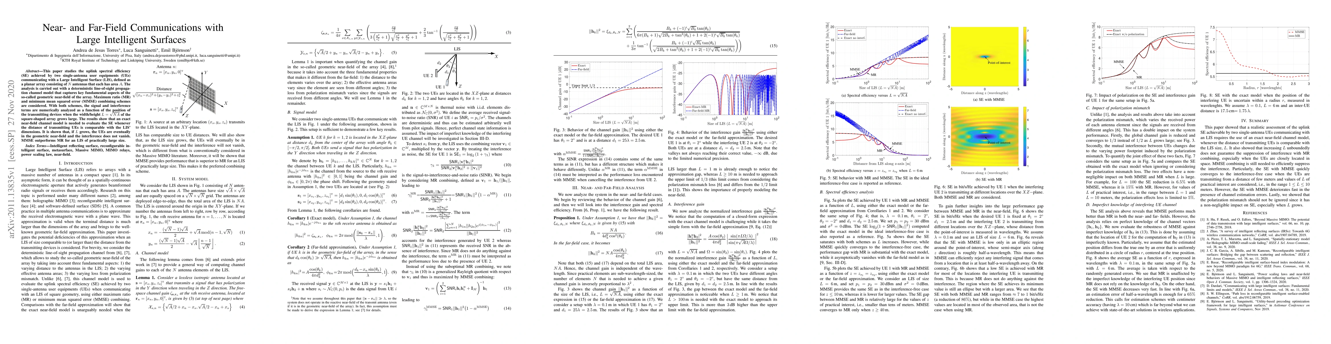 This paper studies the uplink spectral efficiency (SE) achieved by two single-antenna user equipments (UEs) communicating with a Large Intelligent Surface (LIS), defined as a planar array consisting of $N$ antennas that each has area $A$. The analysis is carried out with a deterministic line-of-sight propagation channel model that captures key fundamental aspects of the so-called geometric near-field of the array. Maximum ratio (MR) and minimum mean squared error (MMSE) combining schemes are considered. With both schemes, the signal and interference terms are numerically analyzed as a function of the position of the transmitting devices when the width/height $L = \sqrt{NA}$ of the square-shaped array grows large. The results show that an exact near-field channel model is needed to evaluate the SE whenever the distance of transmitting UEs is comparable with the LIS' dimensions. It is shown that, if $L$ grows, the UEs are eventually in the geometric near-field and the interference does not vanish. MMSE outperforms MR for an LIS of practically large size.