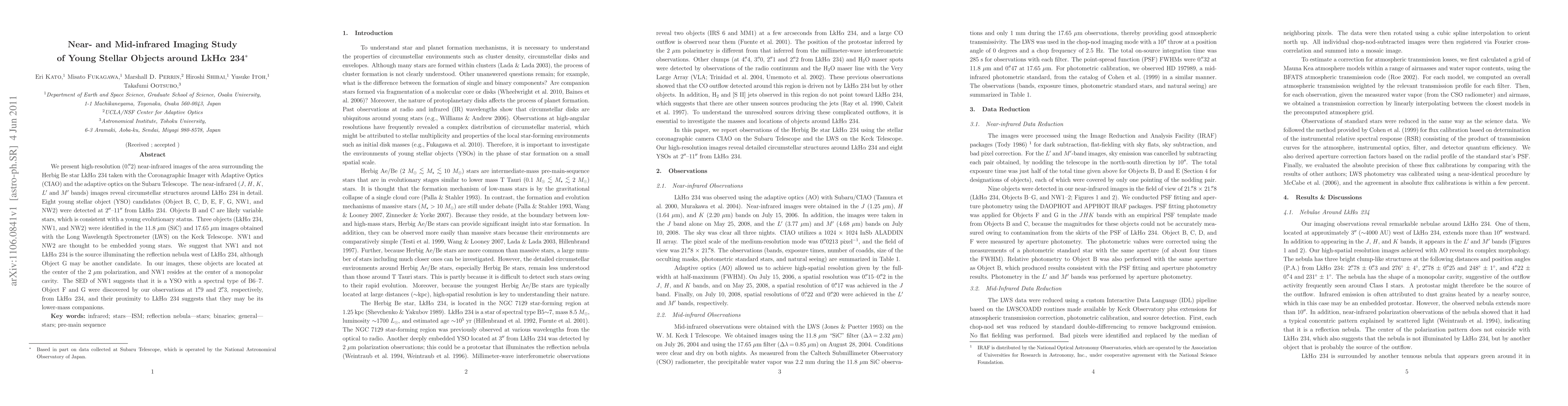 We present high-resolution ($0\farcs2$) near-infrared images of the area surrounding the Herbig Be star LkH$\alpha$ 234 taken with the Coronagraphic Imager with Adaptive Optics (CIAO) and the adaptive optics on the Subaru Telescope. The near-infrared ($J$, $H$, $K$, $L'$ and $M'$ bands) images reveal circumstellar structures around LkH$\alpha$ 234 in detail. Eight young stellar object (YSO) candidates (Object B, C, D, E, F, G, NW1, and NW2) were detected at 2$\arcsec$--11$\arcsec$ from LkH$\alpha$ 234. Objects B and C are likely variable stars, which is consistent with a young evolutionary status. Three objects (LkH$\alpha$ 234, NW1, and NW2) were identified in the 11.8 $\micron$ (SiC) and 17.65 $\micron$ images obtained with the Long Wavelength Spectrometer (LWS) on the Keck Telescope. NW1 and NW2 are thought to be embedded young stars. We suggest that NW1 and not LkH$\alpha$ 234 is the source illuminating the reflection nebula west of LkH$\alpha$ 234, although Object G may be another candidate. In our images, these objects are located at the center of the 2 $\micron$ polarization, and NW1 resides at the center of a monopolar cavity. The SED of NW1 suggests that it is a YSO with a spectral type of B6--7. Object F and G were discovered by our observations at $1\farcs9$ and $2\farcs3$, respectively, from LkH$\alpha$ 234, and their proximity to LkH$\alpha$ 234 suggests that they may be its lower-mass companions.