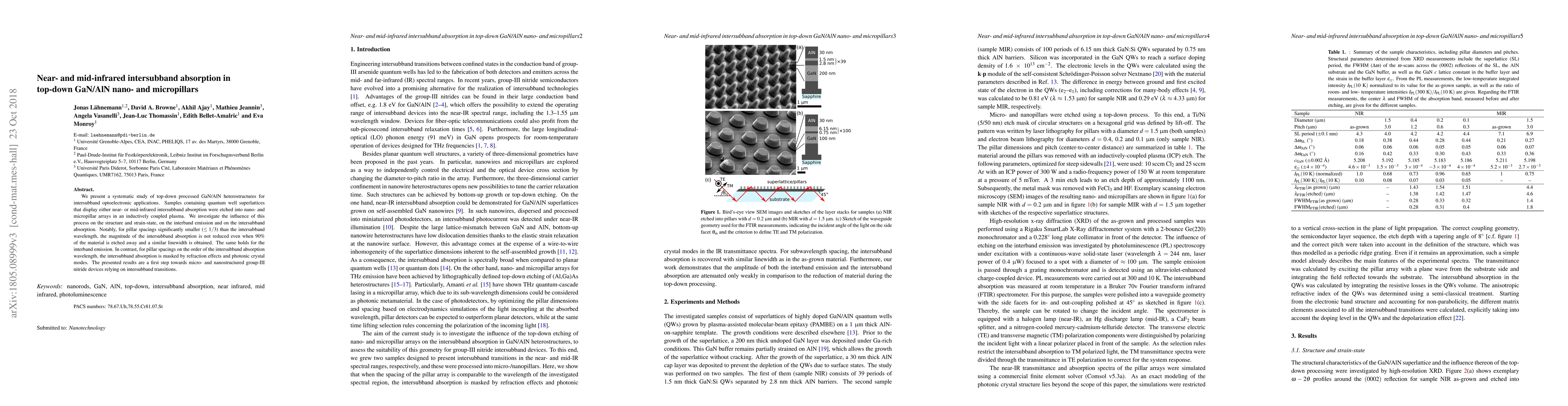 We present a systematic study of top-down processed GaN/AlN heterostructures for intersubband optoelectronic applications. Samples containing quantum well superlattices that display either near- or mid-infrared intersubband absorption were etched into nano- and micropillar arrays in an inductively coupled plasma. We investigate the influence of this process on the structure and strain-state, on the interband emission and on the intersubband absorption. Notably, for pillar spacings significantly smaller ($\leq1/3$) than the intersubband wavelength, the magnitude of the intersubband absorption is not reduced even when 90\% of the material is etched away and a similar linewidth is obtained. The same holds for the interband emission. In contrast, for pillar spacings on the order of the intersubband absorption wavelength, the intersubband absorption is masked by refraction effects and photonic crystal modes. The presented results are a first step towards micro- and nanostructured group-III nitride devices relying on intersubband transitions.