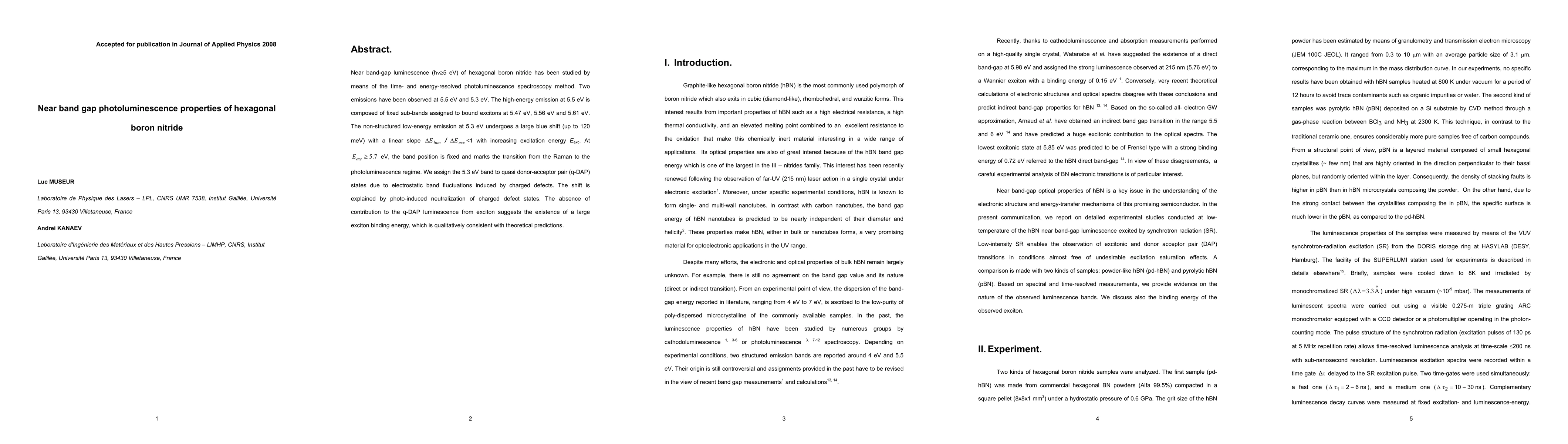 This study investigates the near band-gap photoluminescence of hexagonal boron nitride using time- and energy-resolved spectroscopy, identifying two emissions at 5.5 eV and 5.3 eV. The high-energy emission at 5.5 eV is attributed to bound excitons, while the low-energy emission at 5.3 eV is linked to quasi donor-acceptor pair states due to charged defects.