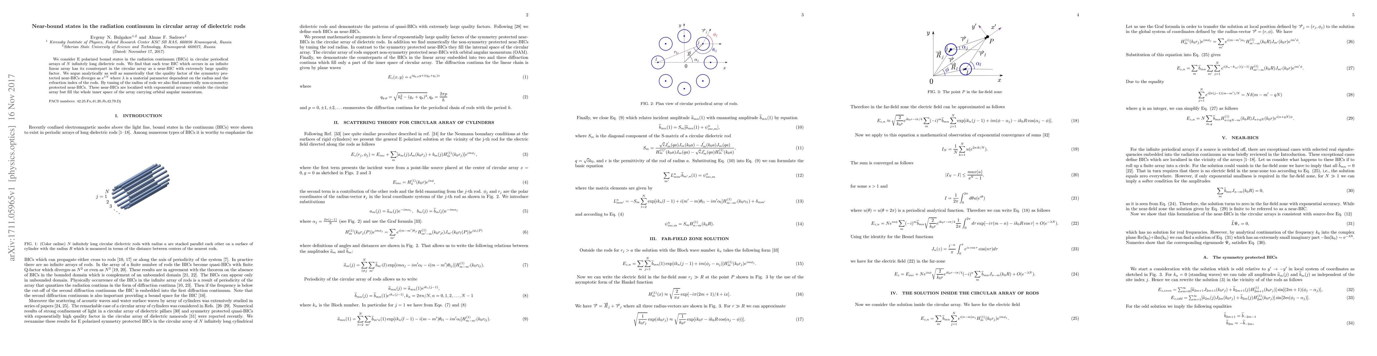 We consider E polarized bound states in the radiation continuum (BICs) in circular periodical arrays of $N$ infinitely long dielectric rods. We find that each true BIC which occurs in an infinite linear array has its counterpart in the circular array as a near-BIC with extremely large quality factor. We argue analytically as well as numerically that the quality factor of the symmetry protected near-BICs diverges as $e^{\lambda N}$ where $\lambda$ is a material parameter dependent on the radius and the refraction index of the rods. By tuning of the radius of rods we also find numerically non-symmetry protected near-BICs. These near-BICs are localized with exponential accuracy outside the circular array but fill the whole inner space of the array carrying orbital angular momentum.