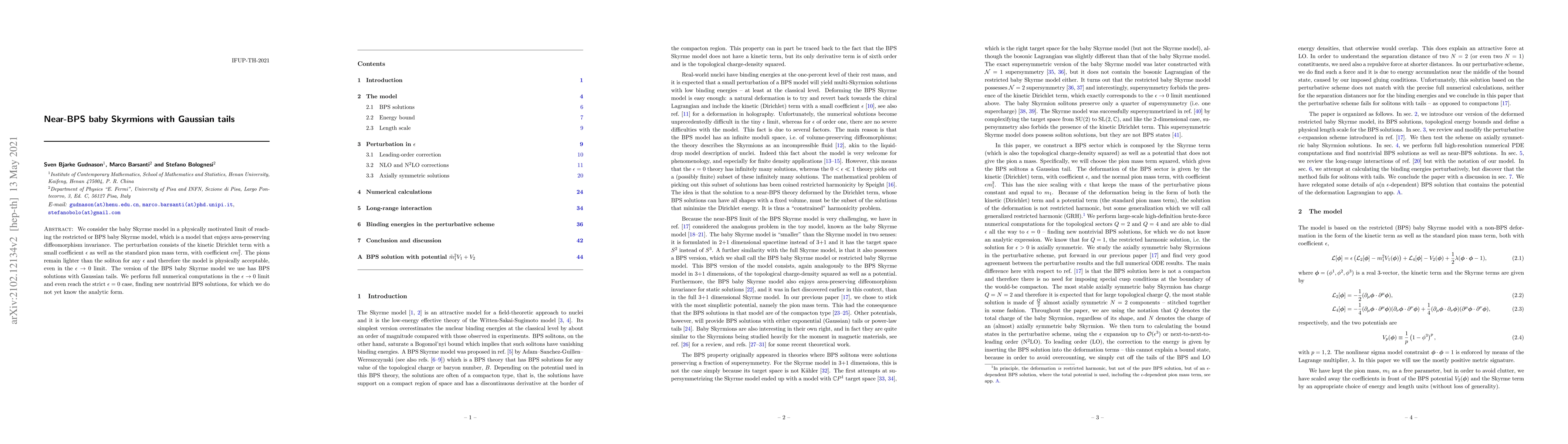 This paper explores the baby Skyrme model in the BPS limit, introducing kinetic and mass perturbations to maintain physical acceptability. Numerical computations reveal new nontrivial BPS solutions with Gaussian tails, even in the strict $\epsilon=0$ limit, although their analytic form remains unknown.