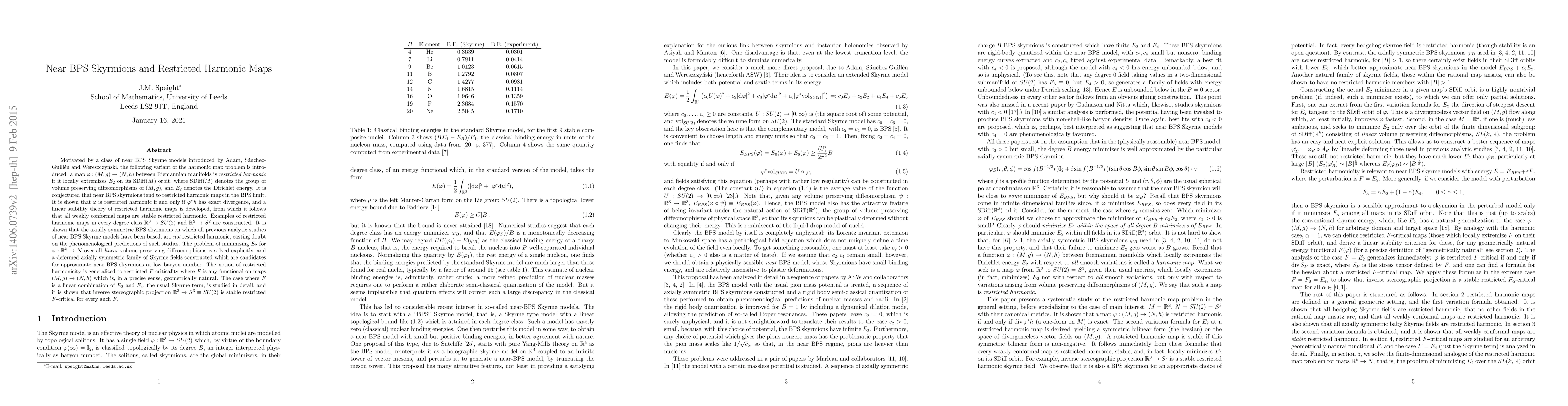 This paper introduces restricted harmonic maps, a variant of the harmonic map problem, that locally extremize the Dirichlet energy on their volume-preserving diffeomorphism orbit. It conjectures that near BPS skyrmions tend to these maps in the BPS limit and constructs examples, including deformed axially symmetric Skyrme fields as candidates for approximate near BPS skyrmions. The study also generalizes the notion to restricted $F$-criticality for geometrically natural functionals.