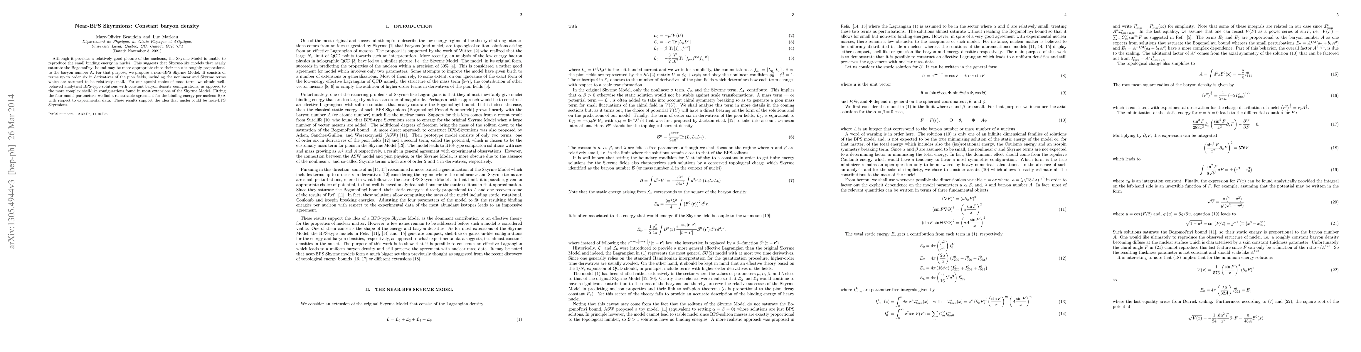 The paper proposes a near-BPS Skyrme Model that nearly saturates the Bogomol'nyi bound, achieving a mass proportional to baryon number A. It finds analytical solutions with constant baryon density configurations, fitting parameters to show remarkable agreement with experimental binding energy per nucleon, suggesting nuclei could be near-BPS Skyrmions.