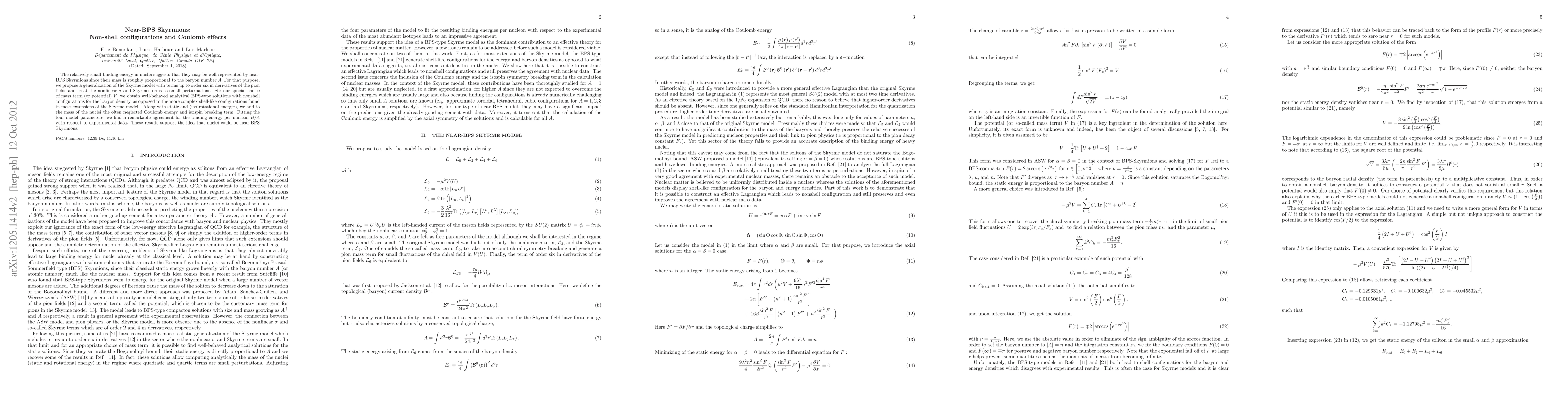 The relatively small binding energy in nuclei suggests that they may be well represented by near-BPS Skyrmions since their mass is roughly proportional to the baryon number $A.$ For that purpose, we propose a generalization of the Skyrme model with terms up to order six in derivatives of the pion fields and treat the nonlinear $\sigma$ and Skyrme terms as small perturbations. For our special choice of mass term (or potential) $V$, we obtain well-behaved analytical BPS-type solutions with non-shell configurations for the baryon density, as opposed to the more complex shell-like configurations found in most extensions of the Skyrme model . Along with static and (iso)rotational energies, we add to the mass of the nuclei the often neglected Coulomb energy and isospin breaking term. Fitting the four model parameters, we find a remarkable agreement for the binding energy per nucleon $B/A$ with respect to experimental data. These results support the idea that nuclei could be near-BPS Skyrmions.