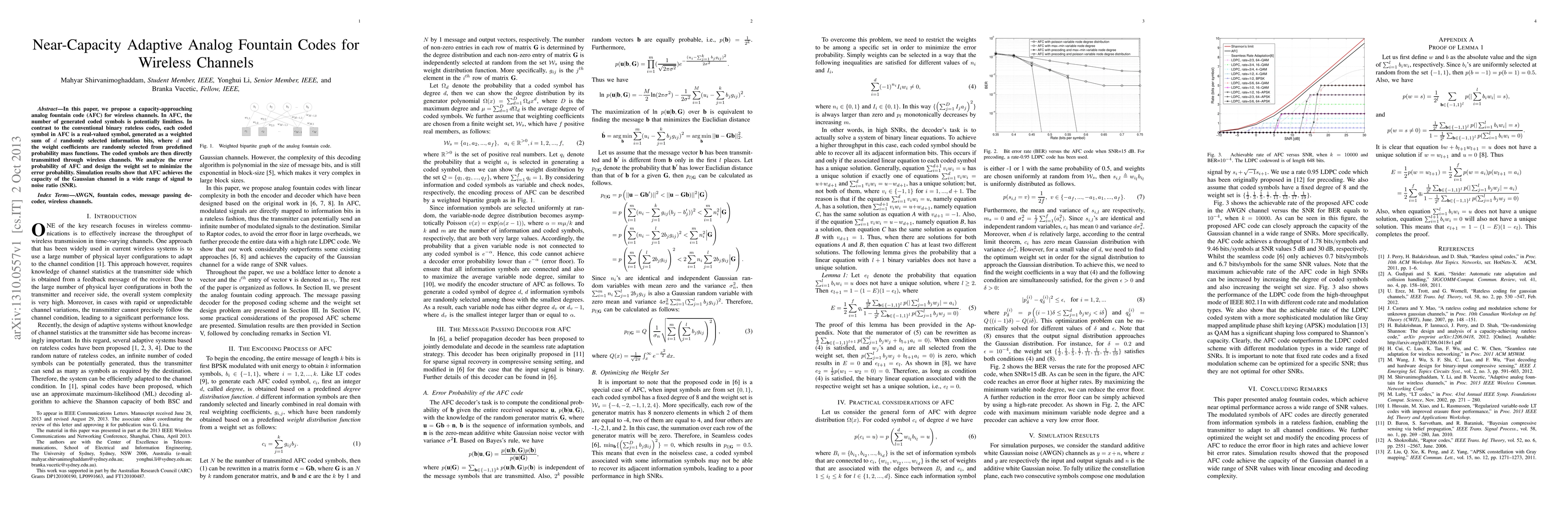 This paper proposes a near-capacity adaptive analog fountain code (AFC) for wireless channels, where each real-valued coded symbol is a weighted sum of randomly selected information bits. Simulation results demonstrate that AFC achieves the capacity of the Gaussian channel across a wide range of SNRs.