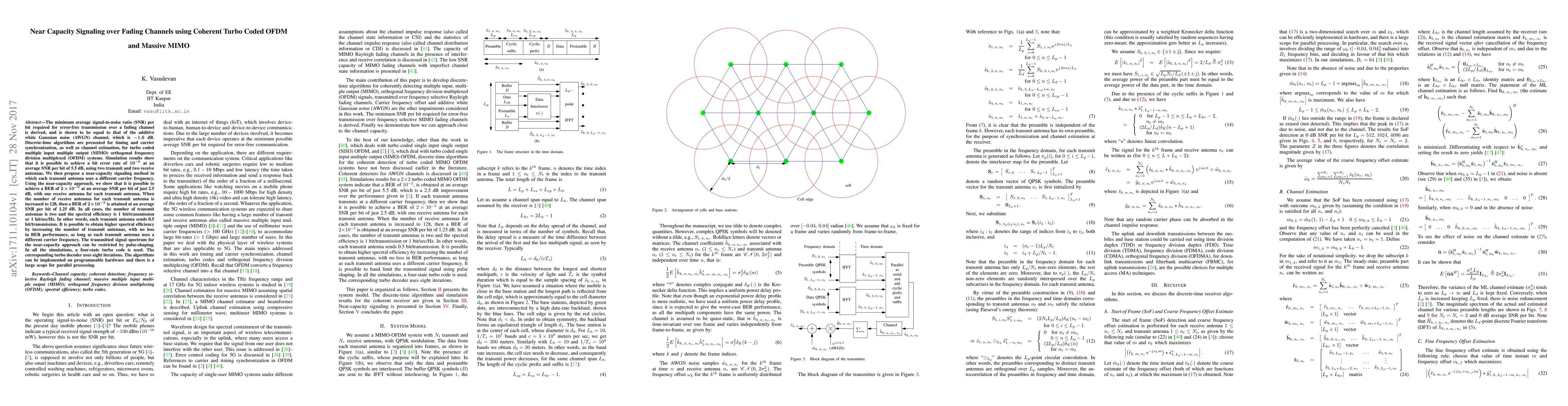 The minimum average signal-to-noise ratio (SNR) per bit required for error-free transmission over a fading channel is derived, and is shown to be equal to that of the additive white Gaussian noise (AWGN) channel, which is $-1.6$ dB. Discrete-time algorithms are presented for timing and carrier synchronization, as well as channel estimation, for turbo coded multiple input multiple output (MIMO) orthogonal frequency division multiplexed (OFDM) systems. Simulation results show that it is possible to achieve a bit error rate of $10^{-5}$ at an average SNR per bit of 5.5 dB, using two transmit and two receive antennas. We then propose a near-capacity signaling method in which each transmit antenna uses a different carrier frequency. Using the near-capacity approach, we show that it is possible to achieve a BER of $2\times 10^{-5}$ at an average SNR per bit of just 2.5 dB, with one receive antenna for each transmit antenna. When the number of receive antennas for each transmit antenna is increased to 128, then a BER of $2\times 10^{-5}$ is attained at an average SNR per bit of 1.25 dB. In all cases, the number of transmit antennas is two and the spectral efficiency is 1 bit/transmission or 1 bit/sec/Hz. In other words, each transmit antenna sends 0.5 bit/transmission. It is possible to obtain higher spectral efficiency by increasing the number of transmit antennas, with no loss in BER performance, as long as each transmit antenna uses a different carrier frequency. The transmitted signal spectrum for the near-capacity approach can be restricted by pulse-shaping. In all the simulations, a four-state turbo code is used. The corresponding turbo decoder uses eight iterations. The algorithms can be implemented on programmable hardware and there is a large scope for parallel processing.