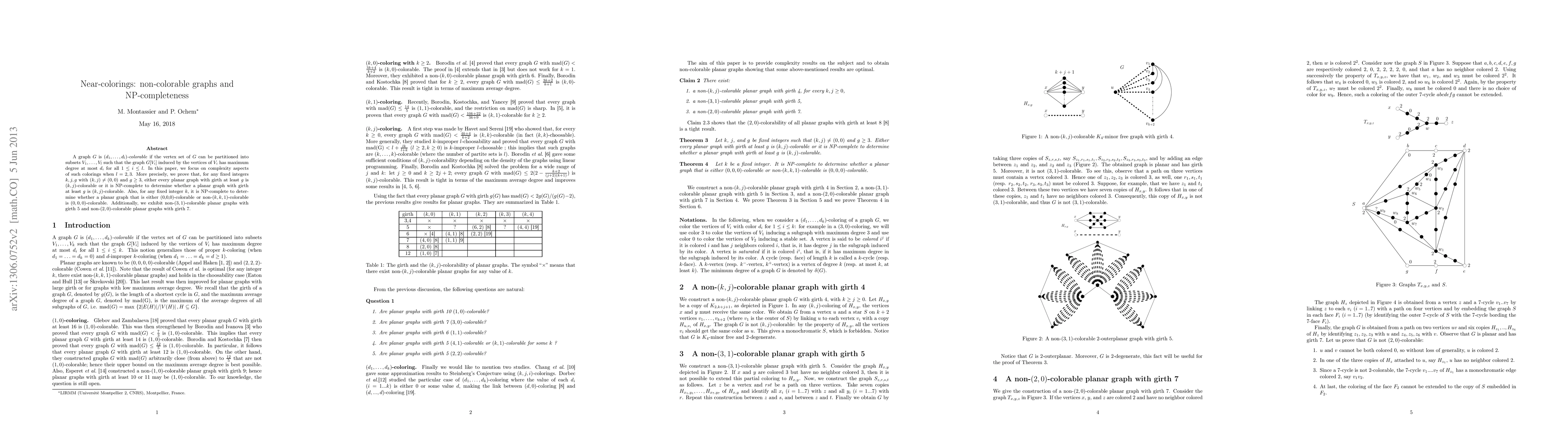 This paper explores the complexity of (d_1, ..., d_l)-colorings for graphs, specifically when l=2,3. It proves that determining (k,j)-colorability for planar graphs with girth at least g is either always possible or NP-complete, depending on the values of k, j, and g. Additionally, it demonstrates the existence of non-colorable planar graphs with specific girths.
