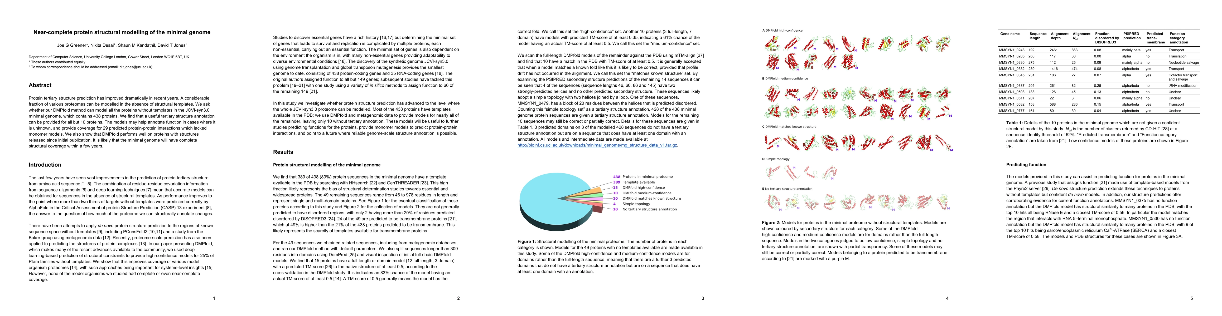 Researchers developed a method to predict protein structures without templates for the JCVI-syn3.0 minimal genome, successfully annotating 438 proteins, with only 10 exceptions.