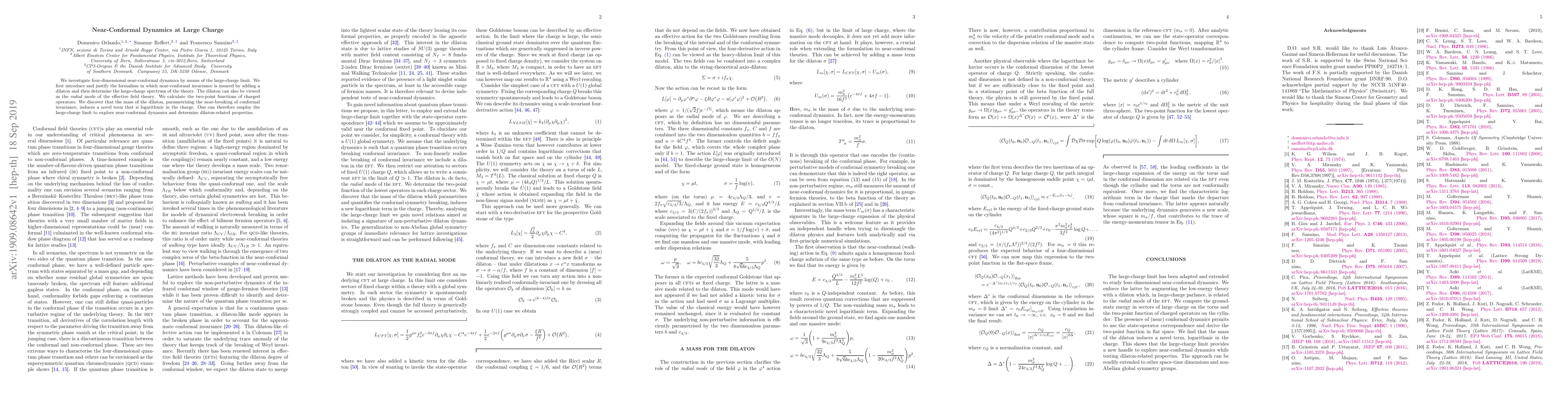 We investigate four-dimensional near-conformal dynamics by means of the large-charge limit. We first introduce and justify the formalism in which near-conformal invariance is insured by adding a dilaton and then determine the large-charge spectrum of the theory. The dilaton can also be viewed as the radial mode of the EFT. We calculate the two-point functions of charged operators. We discover that the mass of the dilaton, parametrising the near-breaking of conformal invariance, induces a novel term that is logarithmic in the charge. One can therefore employ the large-charge limit to explore near-conformal dynamics and determine dilaton-related properties.