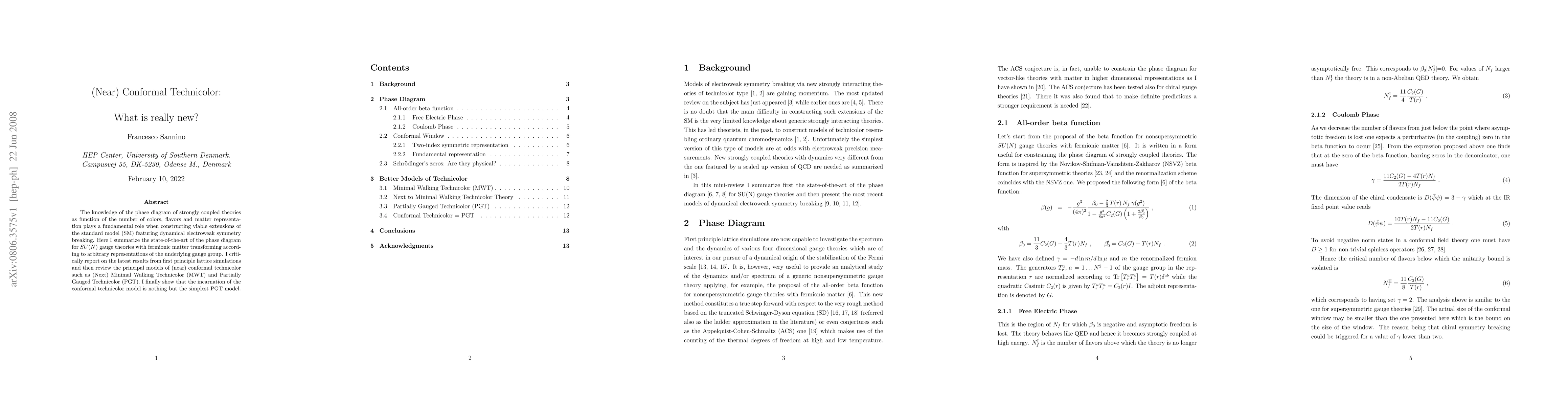This paper reviews the state-of-the-art phase diagram of SU(N) gauge theories and highlights the latest lattice simulation results. It critically examines principal (near) conformal technicolor models, revealing that the simplest version of conformal technicolor is equivalent to the Partially Gauged Technicolor model.