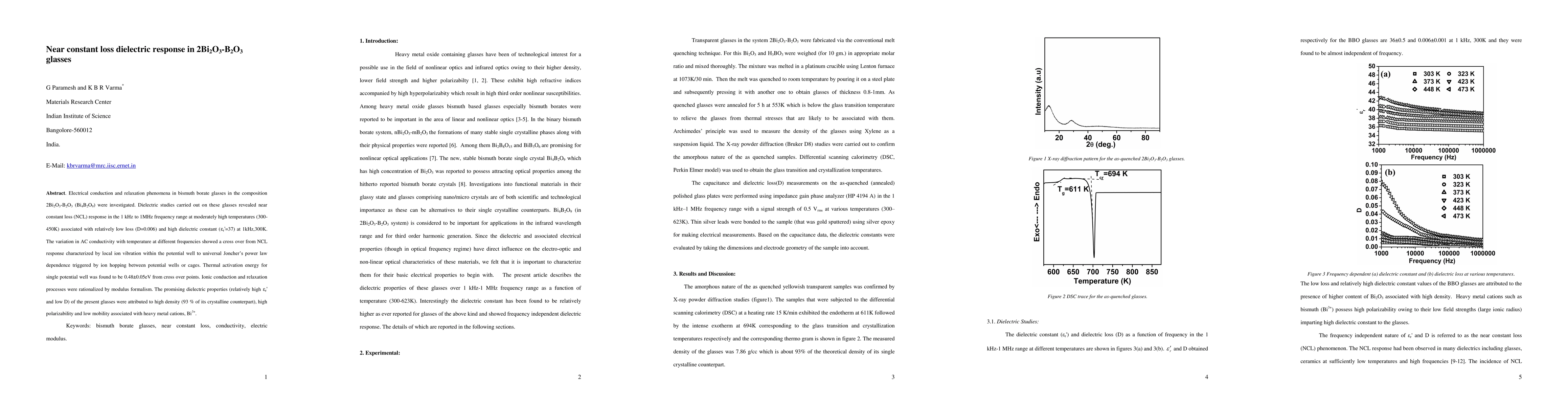 Researchers studied bismuth borate glasses with near constant loss dielectric response in a specific frequency range at moderately high temperatures, exhibiting promising dielectric properties due to heavy metal cations.