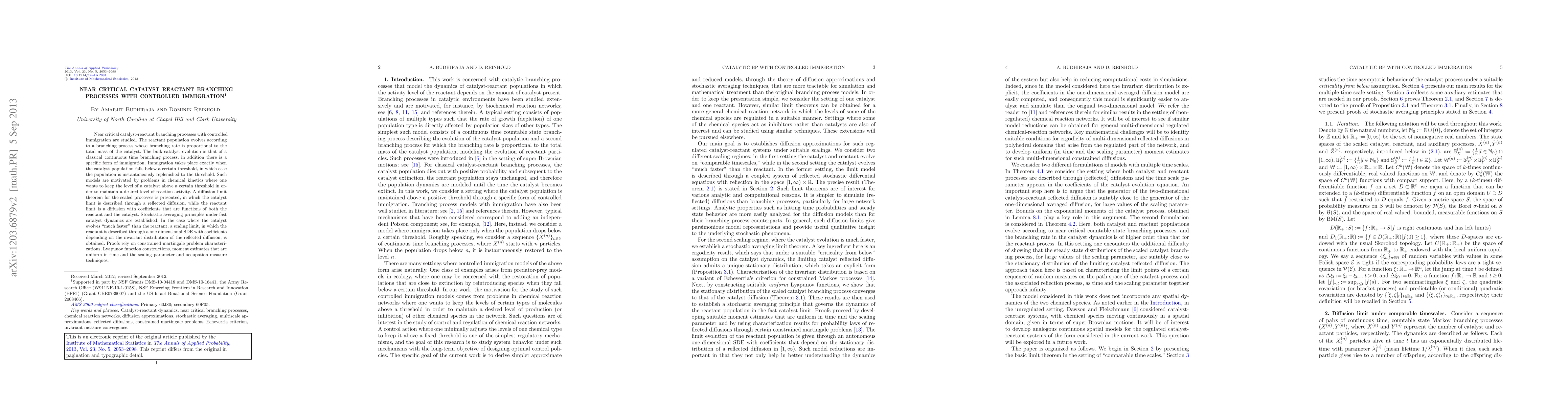 Near critical catalyst-reactant branching processes with controlled immigration are studied. The reactant population evolves according to a branching process whose branching rate is proportional to the total mass of the catalyst. The bulk catalyst evolution is that of a classical continuous time branching process; in addition there is a specific form of immigration. Immigration takes place exactly when the catalyst population falls below a certain threshold, in which case the population is instantaneously replenished to the threshold. Such models are motivated by problems in chemical kinetics where one wants to keep the level of a catalyst above a certain threshold in order to maintain a desired level of reaction activity. A diffusion limit theorem for the scaled processes is presented, in which the catalyst limit is described through a reflected diffusion, while the reactant limit is a diffusion with coefficients that are functions of both the reactant and the catalyst. Stochastic averaging principles under fast catalyst dynamics are established. In the case where the catalyst evolves "much faster" than the reactant, a scaling limit, in which the reactant is described through a one dimensional SDE with coefficients depending on the invariant distribution of the reflected diffusion, is obtained. Proofs rely on constrained martingale problem characterizations, Lyapunov function constructions, moment estimates that are uniform in time and the scaling parameter and occupation measure techniques.