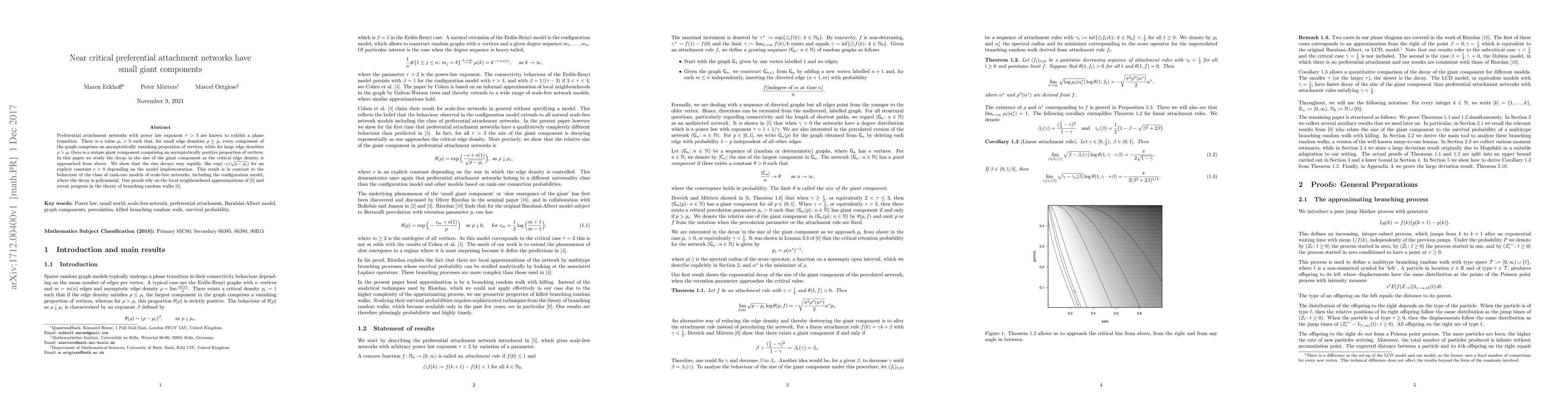 Preferential attachment networks with power law exponent $\tau>3$ are known to exhibit a phase transition. There is a value $\rho_{\rm c}>0$ such that, for small edge densities $\rho\leq \rho_c$ every component of the graph comprises an asymptotically vanishing proportion of vertices, while for large edge densities $\rho>\rho_c$ there is a unique giant component comprising an asymptotically positive proportion of vertices. In this paper we study the decay in the size of the giant component as the critical edge density is approached from above. We show that the size decays very rapidly, like $\exp(-c/ \sqrt{\rho-\rho_c})$ for an explicit constant $c>0$ depending on the model implementation. This result is in contrast to the behaviour of the class of rank-one models of scale-free networks, including the configuration model, where the decay is polynomial. Our proofs rely on the local neighbourhood approximations of [Dereich, Morters, 2013] and recent progress in the theory of branching random walks [Gantert, Hu, Shi, 2011].