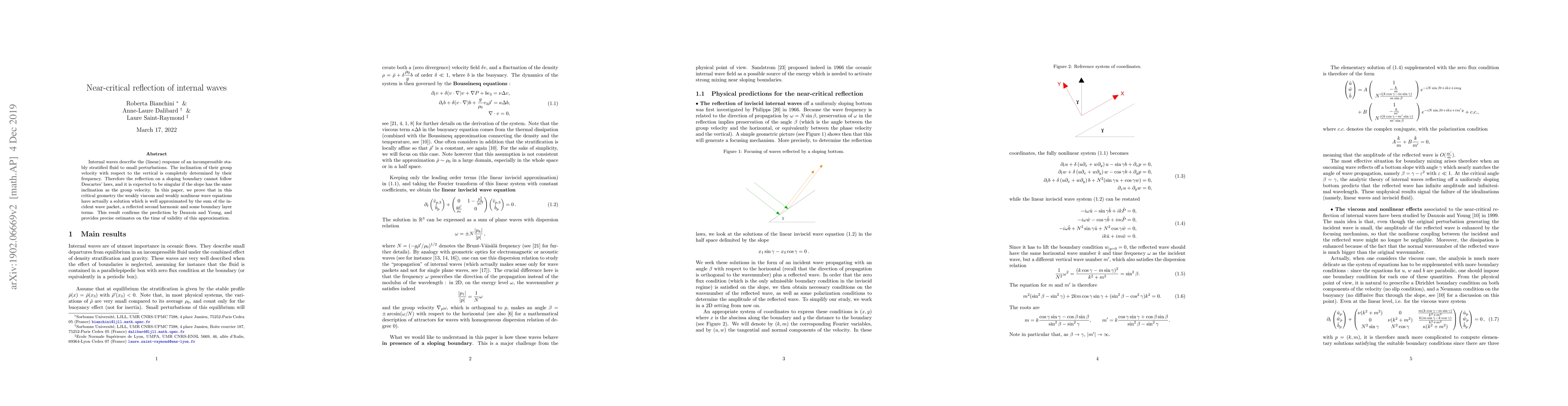This paper proves the existence of a critical reflection scenario for internal waves in stratified fluids, where the reflection follows a unique pattern involving an incident wave, a second harmonic reflection, and boundary layer terms. It confirms a previous prediction and offers precise estimates on the approximation's validity time.