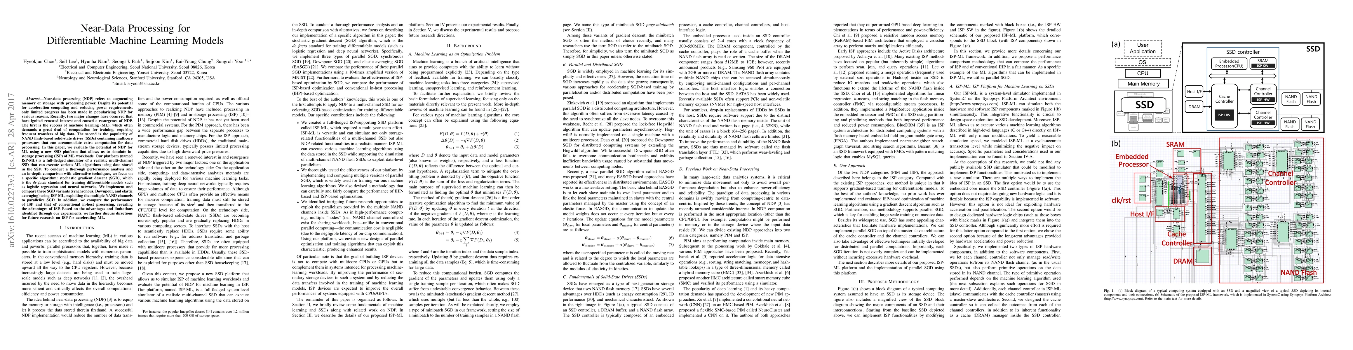 This paper evaluates near-data processing (NDP) for accelerating machine learning (ML) using a new SSD platform called ISP-ML, which simulates in-storage processing (ISP) of ML workloads. The study focuses on stochastic gradient descent (SGD) variants and demonstrates the performance benefits of ISP over conventional in-host processing, highlighting potential directions for future research.