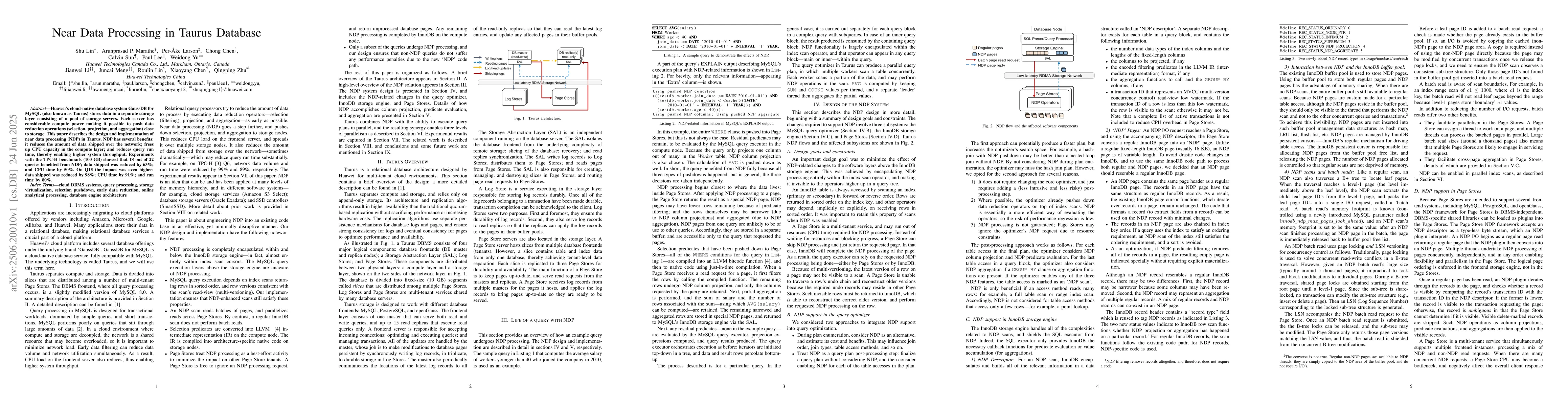 Huawei's cloud-native database system GaussDB for MySQL (also known as Taurus) stores data in a separate storage layer consisting of a pool of storage servers. Each server has considerable compute power making it possible to push data reduction operations (selection, projection, and aggregation) close to storage. This paper describes the design and implementation of near data processing (NDP) in Taurus. NDP has several benefits: it reduces the amount of data shipped over the network; frees up CPU capacity in the compute layer; and reduces query run time, thereby enabling higher system throughput. Experiments with the TPCH benchmark (100 GB) showed that 18 out of 22 queries benefited from NDP; data shipped was reduced by 63 percent; and CPU time by 50 percent. On Q15 the impact was even higher: data shipped was reduced by 98 percent; CPU time by 91 percent; and run time by 80 percent.