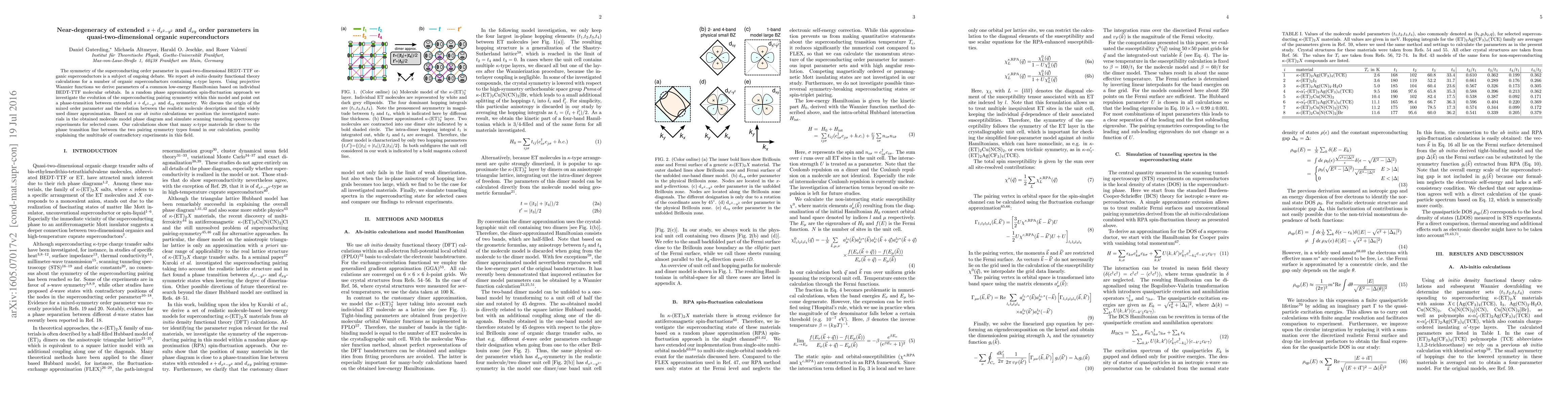 The symmetry of the superconducting order parameter in quasi-two-dimensional BEDT-TTF organic superconductors is a subject of ongoing debate. We report ab initio density functional theory calculations for a number of organic superconductors containing $\kappa$-type layers. Using projective Wannier functions we derive parameters of a common low-energy Hamiltonian based on individual BEDT-TTF molecular orbitals. In a random phase approximation spin-fluctuation approach we investigate the evolution of the superconducting pairing symmetry within this model and point out a phase-transition between extended $s + d_{x^2-y^2}$ and $d_{xy}$ symmetry. We discuss the origin of the mixed order parameter and the relation between the realistic molecule description and the widely used dimer approximation. Based on our ab initio calculations we position the investigated materials in the obtained molecule model phase diagram and simulate scanning tunneling spectroscopy experiments for selected cases. Our calculations show that many $\kappa$-type materials lie close to the phase transition line between the two pairing symmetry types found in our calculation, possibly explaining the multitude of contradictory experiments in this field.