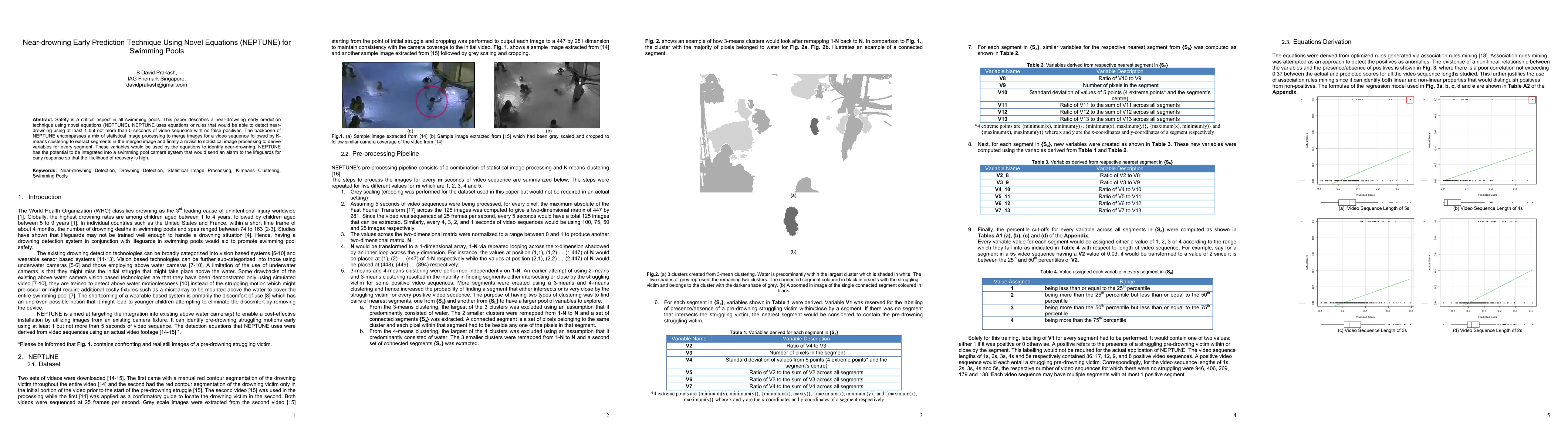 Safety is a critical aspect in all swimming pools. This paper describes a near drowning early prediction technique using novel equations (NEPTUNE). NEPTUNE uses equations or rules that would be able to detect near drowning using at least 1 but not more than 5 seconds of video sequence with no false positives. The backbone of NEPTUNE encompasses a mix of statistical image processing to merge images for a video sequence followed by K means clustering to extract segments in the merged image and finally a revisit to statistical image processing to derive variables for every segment. These variables would be used by the equations to identify near-drowning. NEPTUNE has the potential to be integrated into a swimming pool camera system that would send an alarm to the lifeguards for early response so that the likelihood of recovery is high.