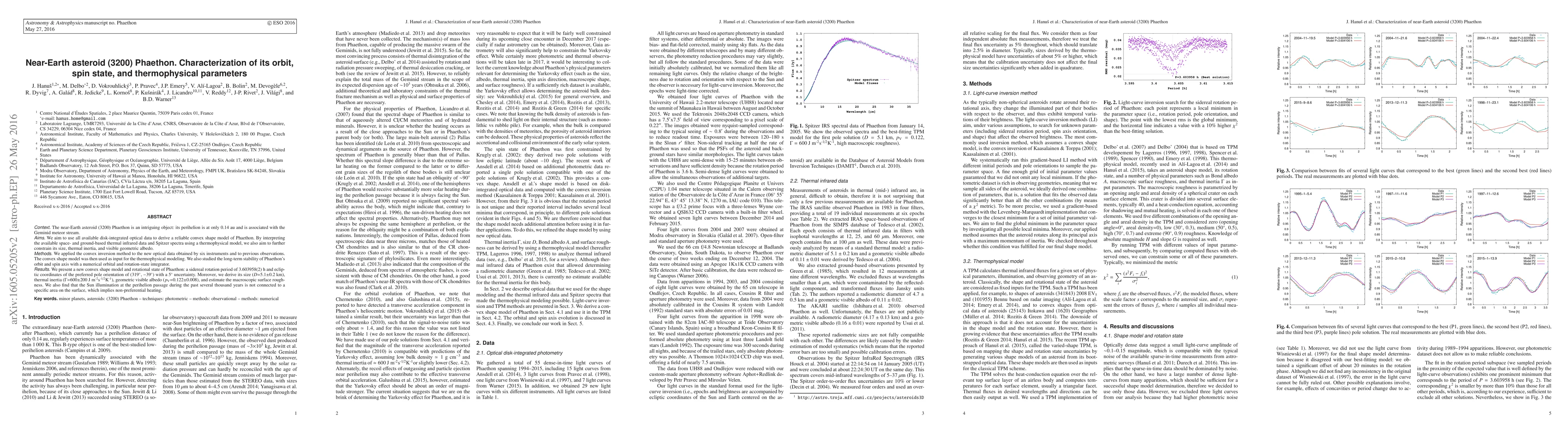 The near-Earth asteroid (3200) Phaethon is an intriguing object: its perihelion is at only 0.14 au and is associated with the Geminid meteor stream. We aim to use all available disk-integrated optical data to derive a reliable convex shape model of Phaethon. By interpreting the available space- and ground-based thermal infrared data and Spitzer spectra using a thermophysical model, we also aim to further constrain its size, thermal inertia, and visible geometric albedo. We applied the convex inversion method to the new optical data obtained by six instruments and to previous observations. The convex shape model was then used as input for the thermophysical modeling. We also studied the long-term stability of Phaethon's orbit and spin axis with a numerical orbital and rotation-state integrator. We present a new convex shape model and rotational state of Phaethon: a sidereal rotation period of 3.603958(2) h and ecliptic coordinates of the preferred pole orientation of (319$^{\circ}$, $-$39$^{\circ}$) with a 5$^{\circ}$ uncertainty. Moreover, we derive its size ($D$=5.1$\pm$0.2 km), thermal inertia ($\Gamma$=600$\pm$200 J m$^{-2}$ s$^{-1/2}$ K$^{-1}$), geometric visible albedo ($p_{\mathrm{V}}$=0.122$\pm$0.008), and estimate the macroscopic surface roughness. We also find that the Sun illumination at the perihelion passage during the past several thousand years is not connected to a specific area on the surface, which implies non-preferential heating.