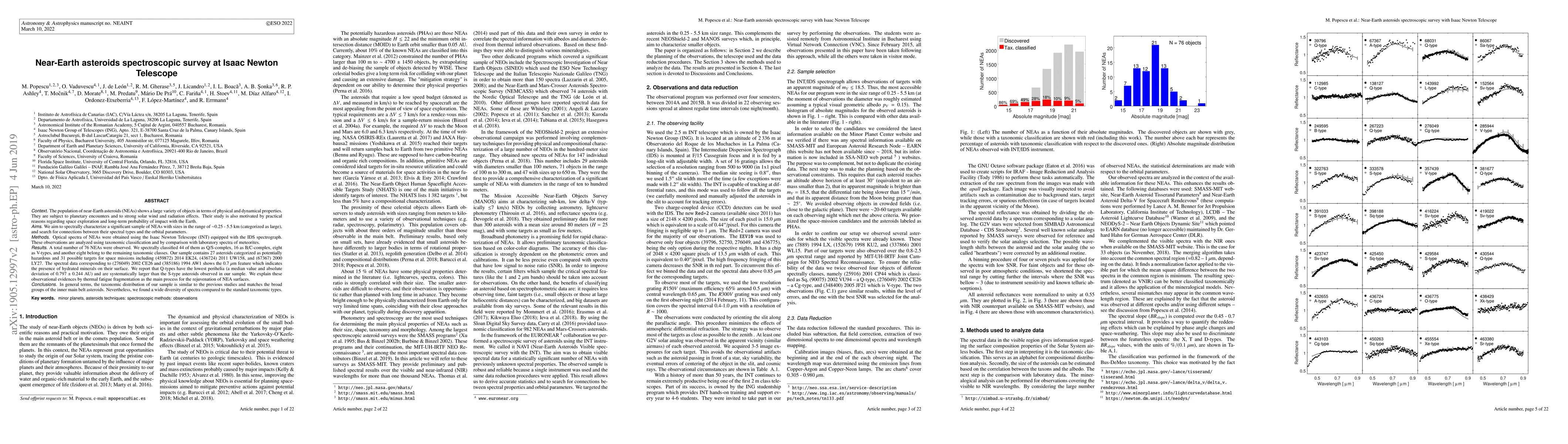 This study spectrally characterizes 76 near-Earth asteroids (NEAs) using the Isaac Newton Telescope, revealing a diverse population categorized into Q/S-complex, B/C-complex, V-types, and other classes. The findings suggest that Q-types have lower perihelia and are larger than S-types, likely due to thermal fatigue fragmentation.