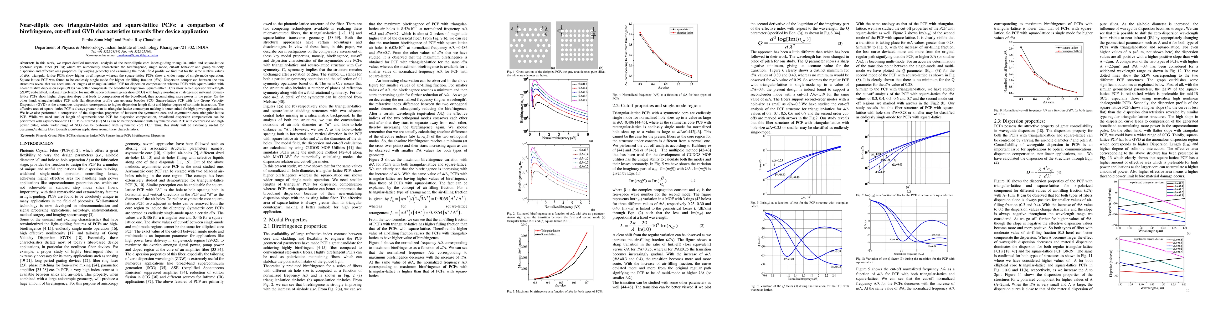 This paper compares near-elliptic core triangular-lattice and square-lattice photonic crystal fibers (PCFs) in terms of birefringence, cut-off behavior, group velocity dispersion, and effective area. Triangular-lattice PCFs exhibit higher birefringence, while square-lattice PCFs offer a wider range of single-mode operation and are better suited for mid-IR supercontinuum generation due to their red-shifted zero dispersion wavelength.