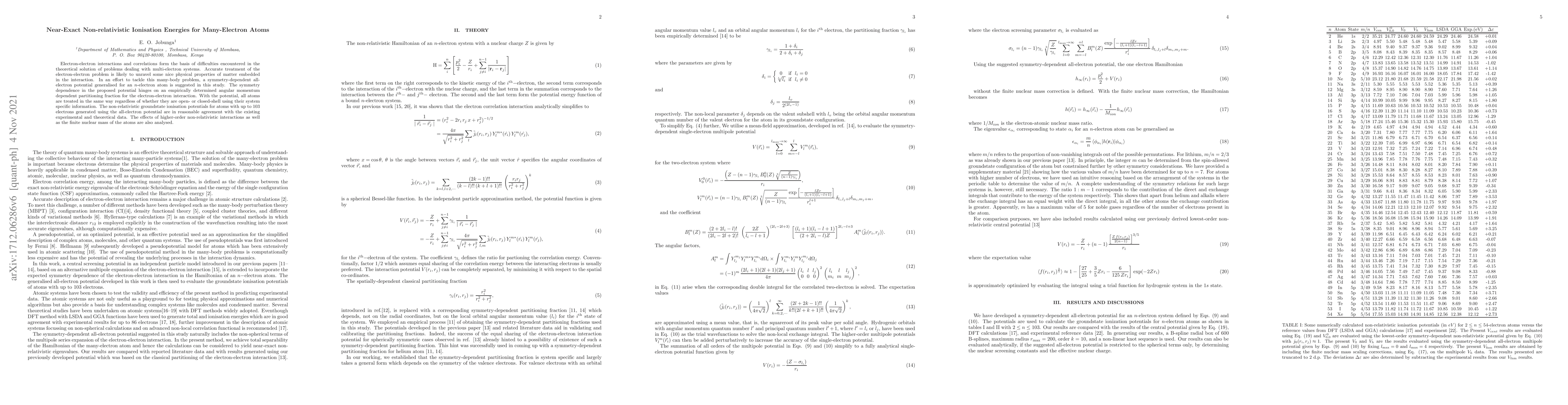 Electron-electron interactions and correlations form the basis of difficulties encountered in the theoretical solution of problems dealing with multi-electron systems. Accurate treatment of the electron-electron problem is likely to unravel some nice physical properties of matter embedded in the interaction. In an effort to tackle this many-body problem, a symmetry-dependent all electron potential generalised for an n-electron atom is suggested in this study. The symmetry dependence in the proposed potential hinges on an empirically determined angular momentum dependent partitioning fraction for the electron-electron interaction. With the potential, all atoms are treated in the same way regardless of whether they are open- or closed-shell using their system specific information. The non-relativistic groundstate ionisation potentials for atoms with up to 103 electrons generated using the all-electron potential are in reasonable agreement with the existing experimental and theoretical data. The effects of higher-order non-relativistic interactions as well as the finite nuclear mass of the atoms are also analysed.