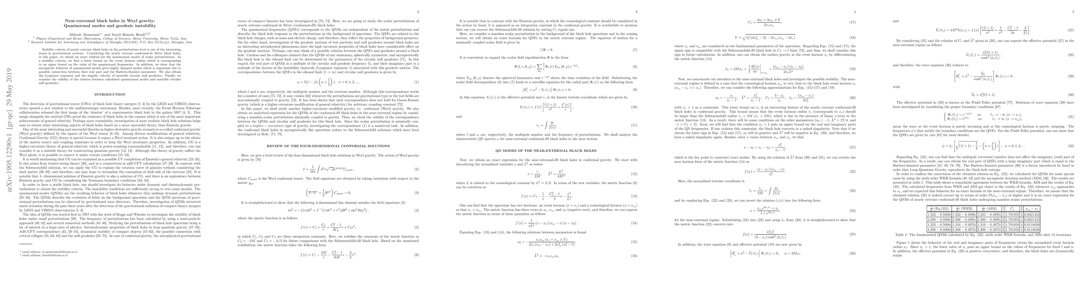 This paper investigates the stability of nearly extreme black holes in Weyl gravity, deriving exact relations for quasinormal modes of scalar perturbations and establishing a lower bound on the event horizon radius. It also examines the connection between quasinormal modes and unstable circular null geodesics, revealing highly damped modes and their potential link to the Barbero-Immirzi parameter.