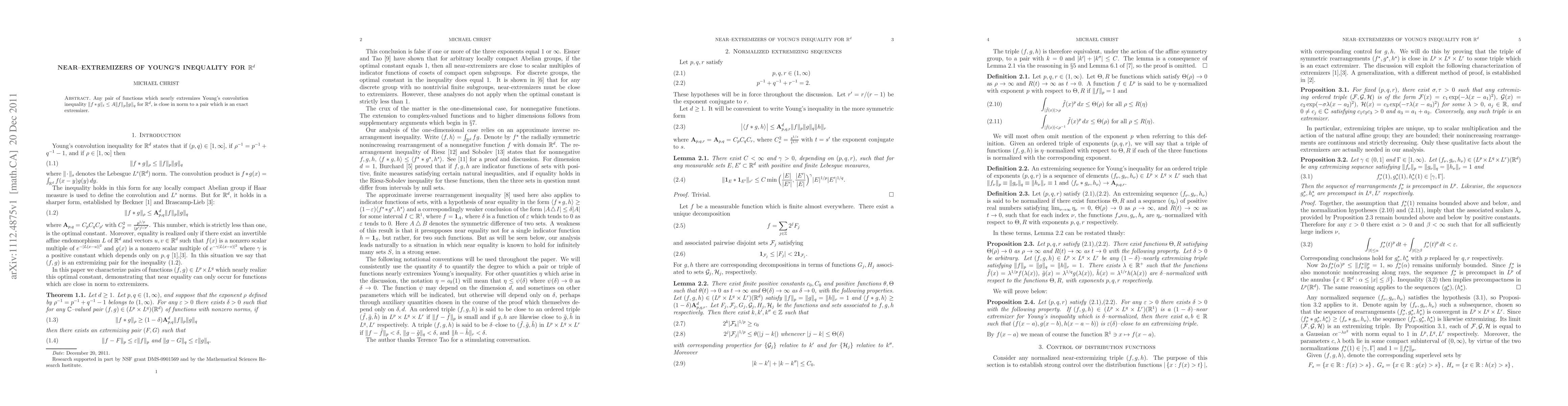 If a pair of functions nearly extremizes Young's convolution inequality for R^d, with all three exponents finite and strictly greater than 1, then each function is close in norm to a Gaussian. The proof relies on the Riesz-Sobolev rearrangement inequality and in particular, on an approximate inverse Riesz-Sobolev inequality established in a companion paper.