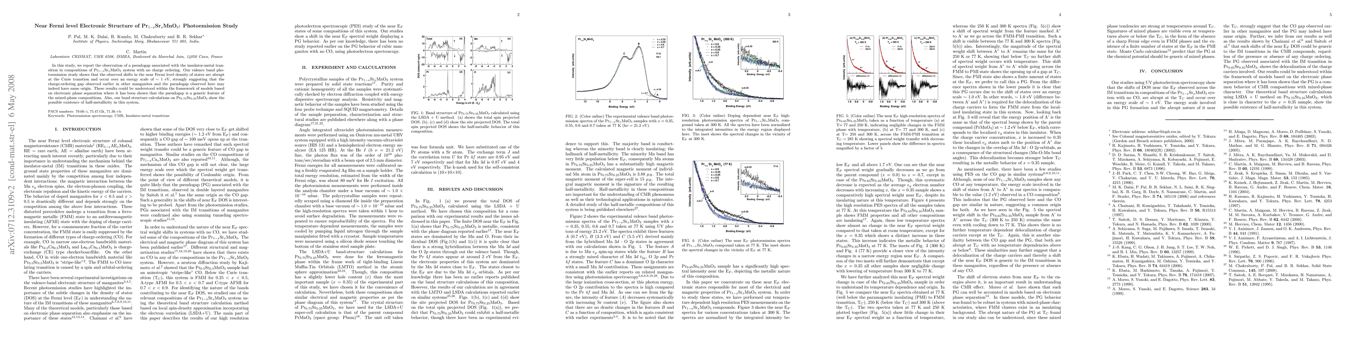 This study observes a pseudogap linked to the insulator-metal transition in Pr$_{1-x}$Sr$_x$MnO$_3$ without charge ordering, suggesting a common origin with charge-ordering gaps in other manganites. The valence band photoemission reveals abrupt shifts in the near Fermi level density of states around the Curie transition, indicating potential half-metallicity in Pr$_{0.75}$Sr$_{0.25}$MnO$_3$.