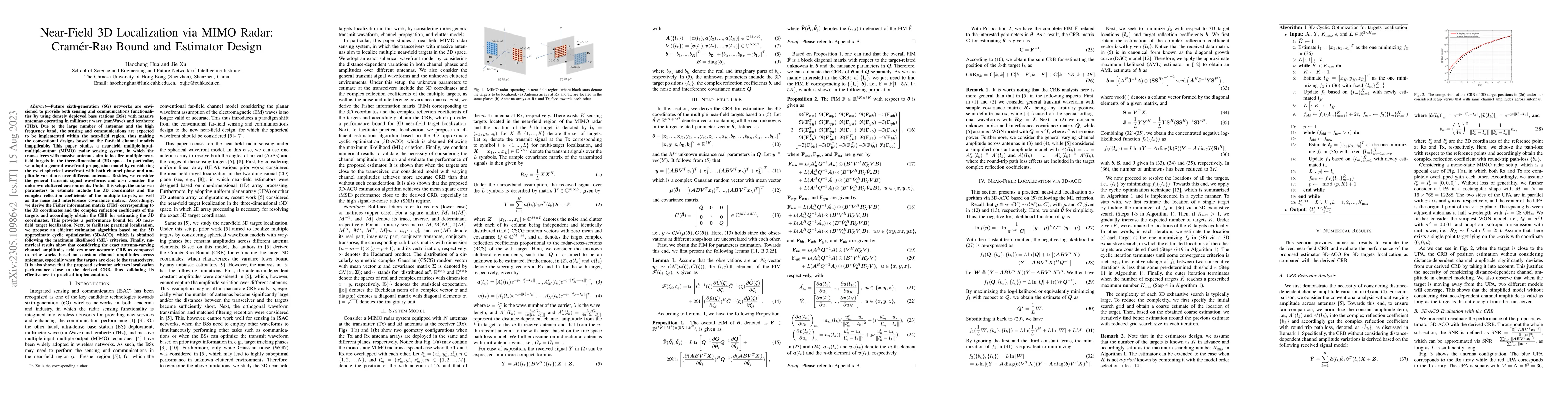 Future sixth-generation (6G) networks are envisioned to provide both sensing and communications functionalities by using densely deployed base stations (BSs) with massive antennas operating in millimeter wave (mmWave) and terahertz (THz). Due to the large number of antennas and the high frequency band, the sensing and communications will operate within the near-field region, thus making the conventional designs based on the far-field channel models inapplicable. This paper studies a near-field multiple-input-multiple-output (MIMO) radar sensing system, in which the transceivers with massive antennas aim to localize multiple near-field targets in the three-dimensional (3D) space. In particular, we adopt a general wavefront propagation model by considering the exact spherical wavefront with both channel phase and amplitude variations over different antennas. Besides, we consider the general transmit signal waveforms and also consider the unknown cluttered environments. Under this setup, the unknown parameters to estimate include the 3D coordinates and the complex reflection coefficients of the multiple targets, as well as the noise and interference covariance matrix. Accordingly, we derive the Cram\'er-Rao bound (CRB) for estimating the target coordinates. Next, to facilitate practical localization, we propose an efficient estimator based on the 3D approximate cyclic optimization (3D-ACO), which is obtained following the maximum likelihood (ML) criterion. Finally, numerical results show that considering the exact antenna-varying channel amplitudes achieves more accurate CRB as compared to prior works based on constant channel amplitudes across antennas, especially when the targets are close to the transceivers. It is also shown that the proposed estimator achieves localization performance close to the derived CRB, thus validating its superior performance.