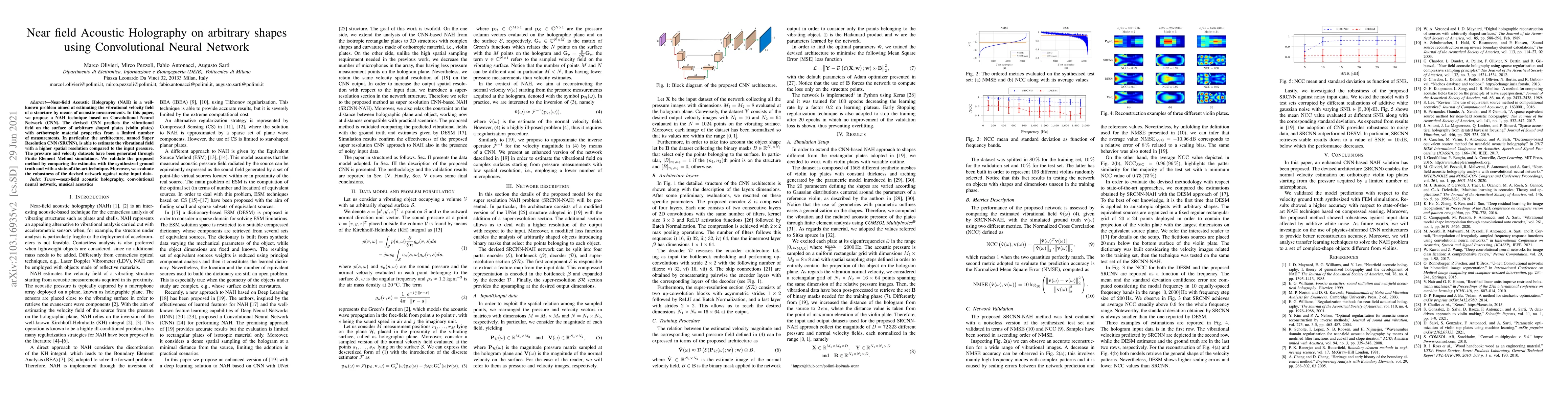 Near-field Acoustic Holography (NAH) is a well-known problem aimed at estimating the vibrational velocity field of a structure by means of acoustic measurements. In this paper, we propose a NAH technique based on Convolutional Neural Network (CNN). The devised CNN predicts the vibrational field on the surface of arbitrary shaped plates (violin plates) with orthotropic material properties from a limited number of measurements. In particular, the architecture, named Super Resolution CNN (SRCNN), is able to estimate the vibrational field with a higher spatial resolution compared to the input pressure. The pressure and velocity datasets have been generated through Finite Element Method simulations. We validate the proposed method by comparing the estimates with the synthesized ground truth and with a state-of-the-art technique. Moreover, we evaluate the robustness of the devised network against noisy input data.