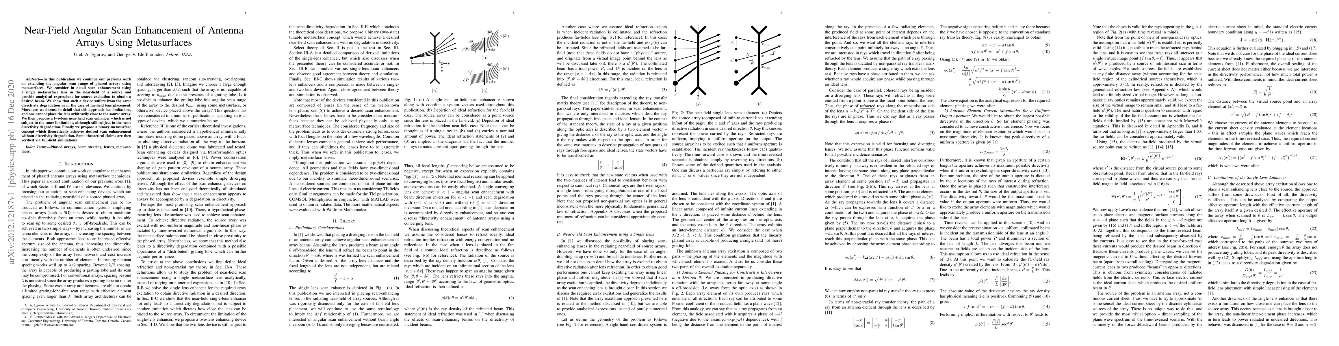 This paper explores the enhancement of near-field angular scan range in antenna arrays using metasurfaces, proposing a two-lens near-field scan enhancer to overcome limitations of single-lens approaches. It also introduces a binary metasurface concept that theoretically avoids directivity degradation, with claims verified through simulations.