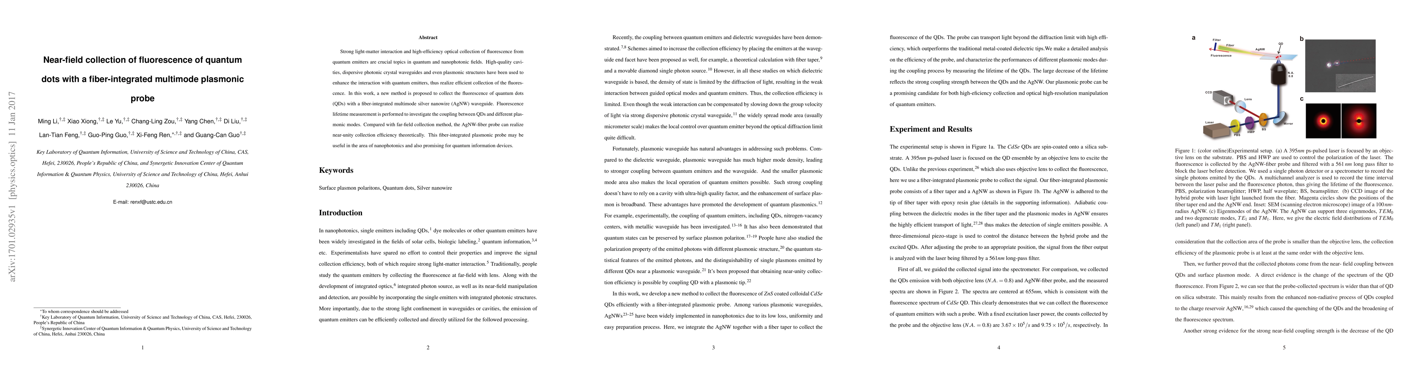 This paper proposes a novel fiber-integrated multimode plasmonic probe using a silver nanowire waveguide for near-field collection of quantum dot fluorescence, achieving near-unity collection efficiency compared to traditional far-field methods. The study demonstrates the potential of this probe for applications in nanophotonics and quantum information devices.