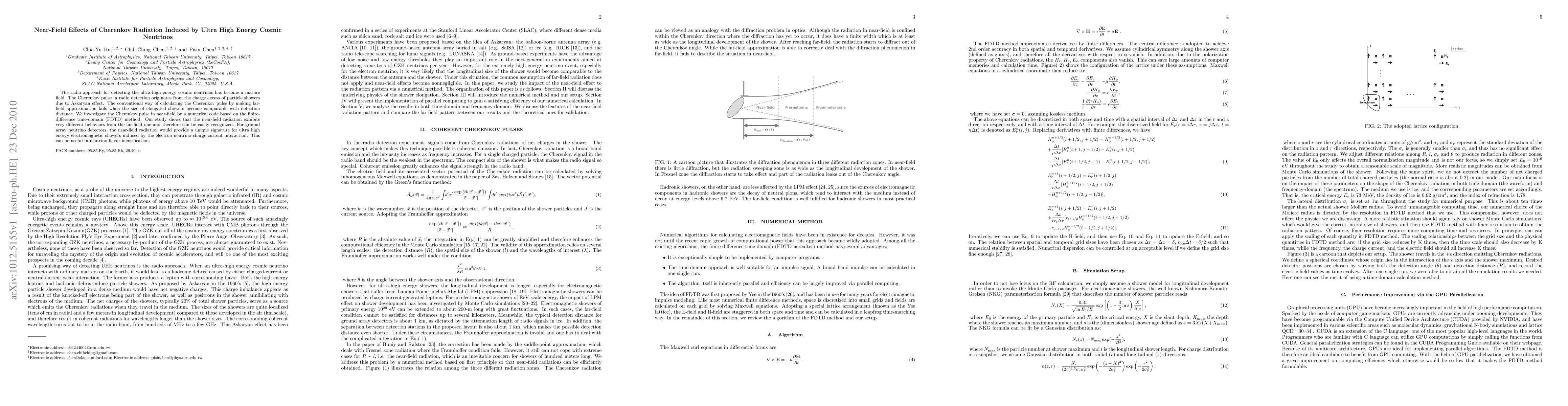 This paper investigates the near-field effects of Cherenkov radiation from ultra-high energy cosmic neutrinos detected via radio waves, using a numerical FDTD method. It reveals distinct behaviors of near-field radiation compared to the far-field, offering a unique signature for neutrino flavor identification in ground array detectors.