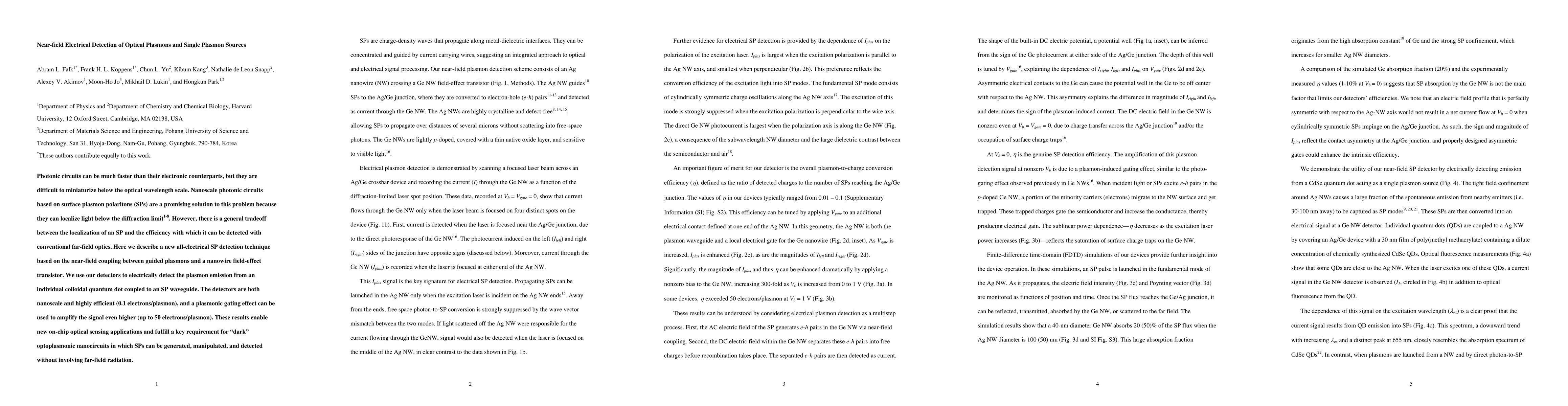 Photonic circuits can be much faster than their electronic counterparts, but they are difficult to miniaturize below the optical wavelength scale. Nanoscale photonic circuits based on surface plasmon polaritons (SPs) are a promising solution to this problem because they can localize light below the diffraction limit. However, there is a general tradeoff between the localization of an SP and the efficiency with which it can be detected with conventional far-field optics. Here we describe a new all-electrical SP detection technique based on the near-field coupling between guided plasmons and a nanowire field-effect transistor. We use the technique to electrically detect the plasmon emission from an individual colloidal quantum dot coupled to an SP waveguide. Our detectors are both nanoscale and highly efficient (0.1 electrons/plasmon), and a plasmonic gating effect can be used to amplify the signal even higher (up to 50 electrons/plasmon). These results enable new on-chip optical sensing applications and are a key step towards "dark" optoplasmonic nanocircuits in which SPs can be generated, manipulated, and detected without involving far-field radiation.