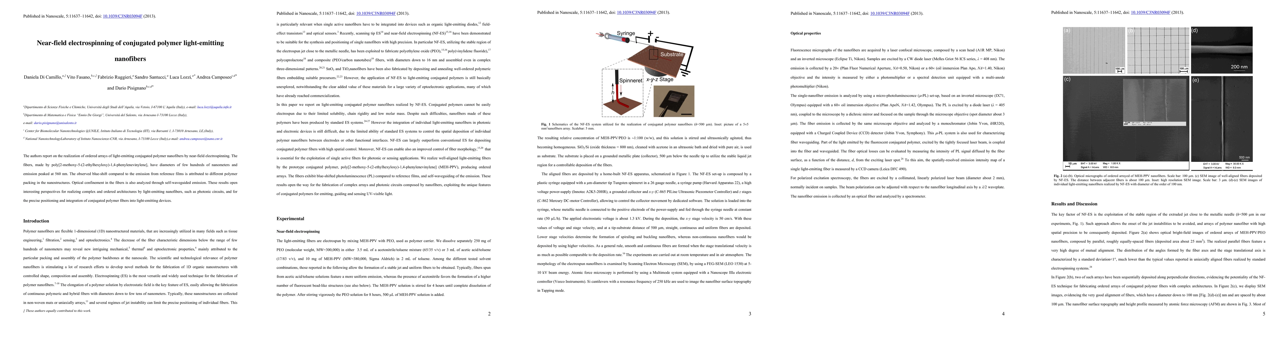 The research presents a method for creating ordered arrays of light-emitting conjugated polymer nanofibers using near-field electrospinning, showing a blue-shift in emission due to altered polymer packing, and highlighting potential applications in photonic circuits and device integration.