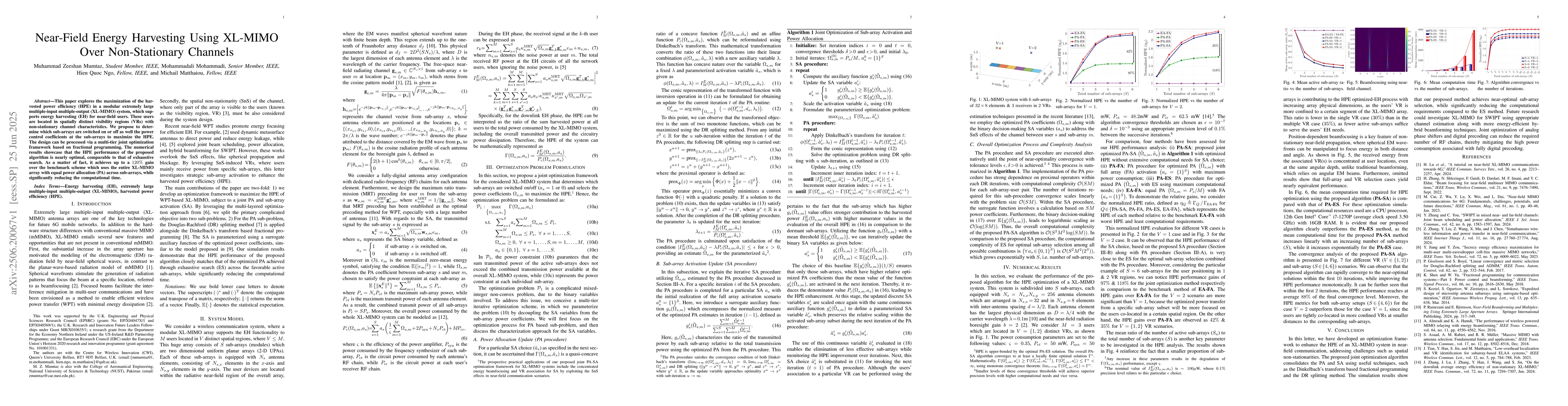 This paper explores the maximization of the harvested power efficiency (HPE) in a modular extremely large multiple-input multiple-output (XL-MIMO) system, which supports energy harvesting (EH) for near-field users. These users are located in spatially distinct visibility regions (VRs) with non-stationary channel characteristics. We propose to determine which sub-arrays are switched on or off as well the power control coefficients at the sub-arrays to maximize the HPE. The design can be processed via a multi-tier joint optimization framework based on fractional programming. The numerical results showcase that the HPE performance of the proposed algorithm is nearly optimal, comparable to that of exhaustive search. As a matter of fact, it achieves up to a 120% gain over the benchmark scheme which uses the entire XL-MIMO array with equal power allocation (PA) across sub-arrays, while significantly reducing the computational time.