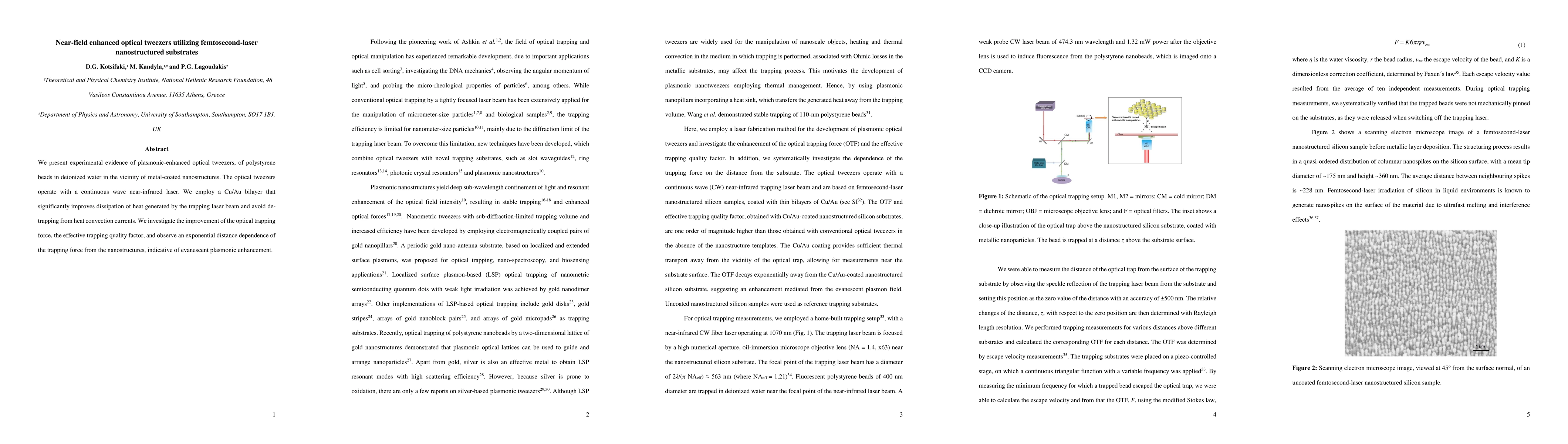 This paper demonstrates enhanced optical tweezers using femtosecond-laser nanostructured substrates, showing improved trapping force and quality factor for polystyrene beads near Cu/Au bilayers. The study reveals an exponential distance dependence of the trapping force due to the evanescent plasmon field.