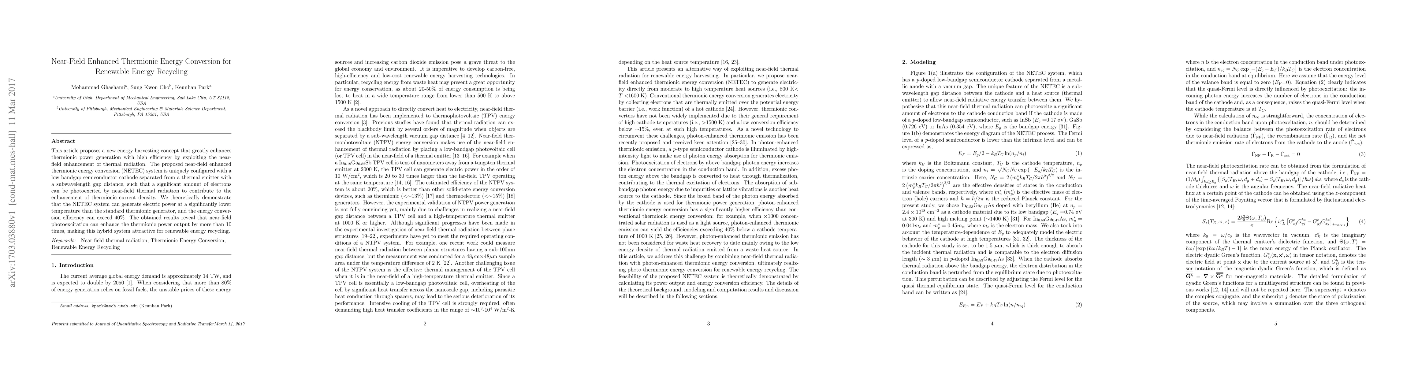 This paper introduces a novel NETEC system that significantly boosts thermionic energy conversion efficiency through near-field thermal radiation enhancement, achieving power generation at lower temperatures and conversion efficiencies exceeding 40%. The system's design, featuring a low-bandgap semiconductor cathode and a subwavelength gap, enables over tenfold enhancement in thermionic current density.