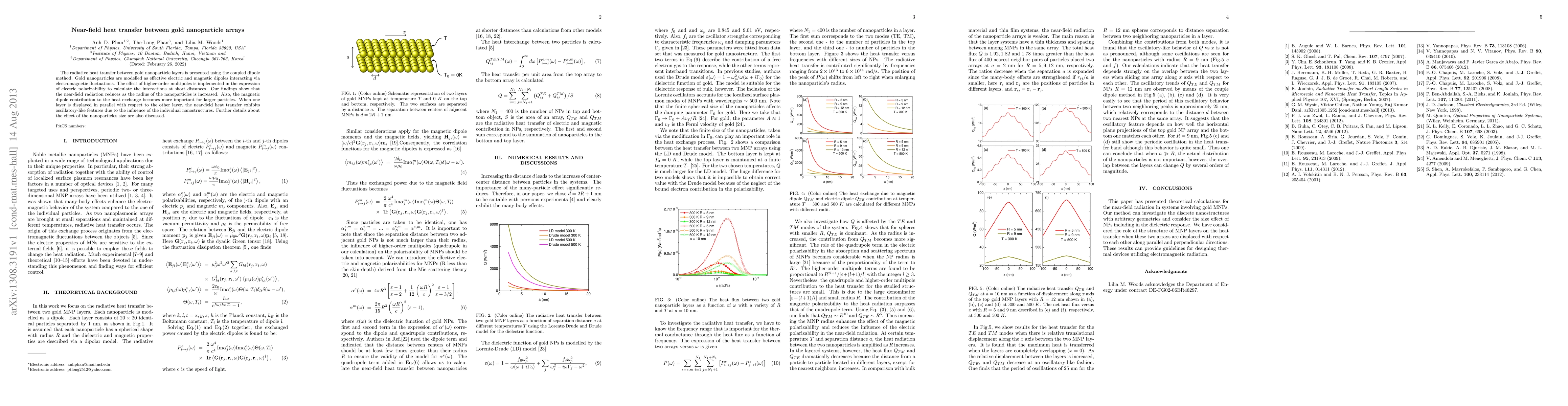 The radiative heat transfer between gold nanoparticle layers is presented using the coupled dipole method. Gold nanoparticles are modelled as effective electric and magnetic dipoles interacting via electromagnetic fluctuations. The effect of higher-order multipoles is implemented in the expression of electric polarizability to calculate the interactions at short distances. Our findings show that the near-field radiation reduces as the radius of the nanoparticles is increased. Also, the magnetic dipole contribution to the heat exchange becomes more important for larger particles. When one layer is displayed in parallel with respect to the other layer, the near-field heat transfer exhibits oscillatory-like features due to the influence of the individual nanostructures. Further details about the effect of the nanoparticles size are also discussed.