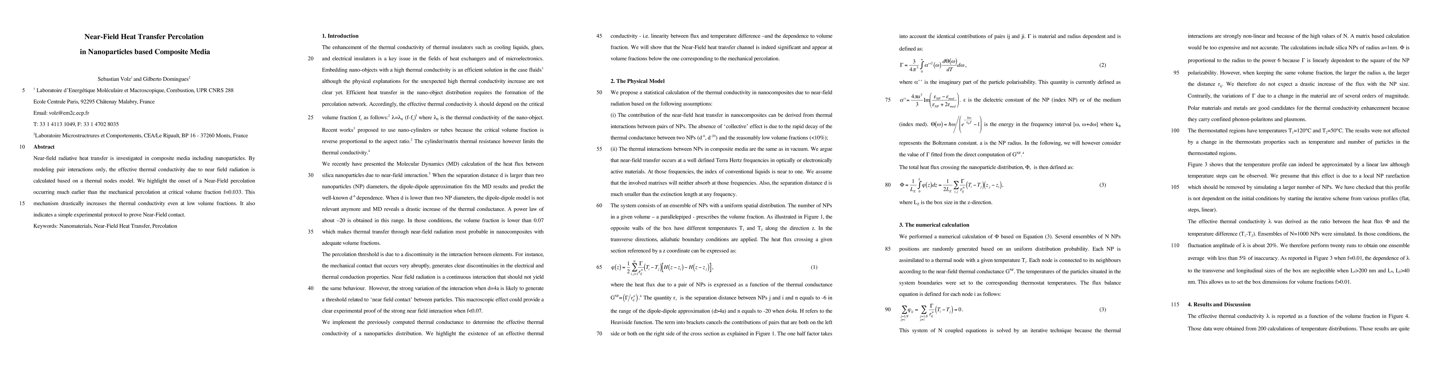 Near-field radiative heat transfer is investigated in composite media including nanoparticles. By modeling pair interactions only, the effective thermal conductivity due to near field radiation is calculated based on a thermal nodes model. We highlight the onset of a Near-Field percolation occurring much earlier than the mechanical percolation at critical volume fraction f=0.033. This 15 mechanism drastically increases the thermal conductivity even at low volume fractions. It also indicates a simple experimental protocol to prove Near-Field contact.