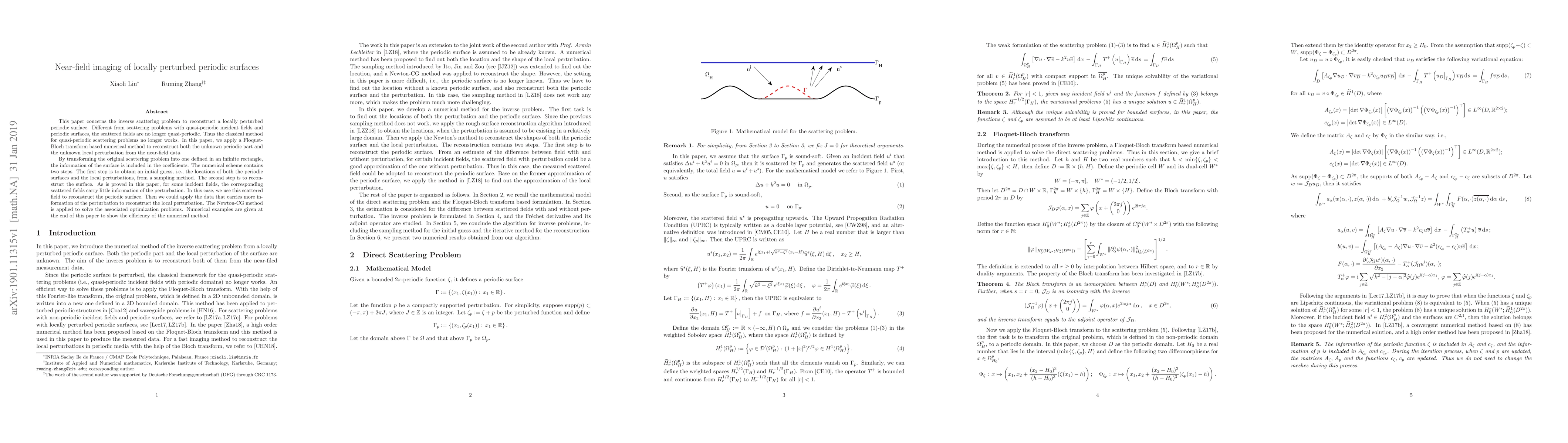 This paper proposes a Floquet-Bloch transform based numerical method to reconstruct locally perturbed periodic surfaces from near-field data, addressing the inverse scattering problem where classical quasi-periodic methods fail. The method involves transforming the problem into an infinite rectangle and using a two-step numerical scheme with the Newton-CG method to optimize the reconstruction.