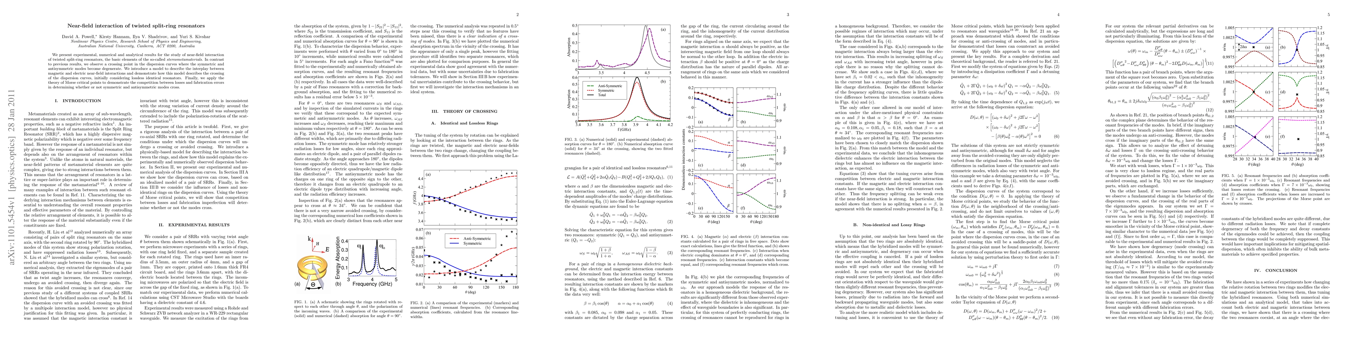 This paper investigates the near-field interaction of twisted split-ring resonators, revealing a degeneracy point in their dispersion curves where symmetric and antisymmetric modes intersect. It introduces a model to explain the magnetic and electric near-field interactions and applies Morse critical points theory to analyze the influence of losses and fabrication errors on mode crossing.